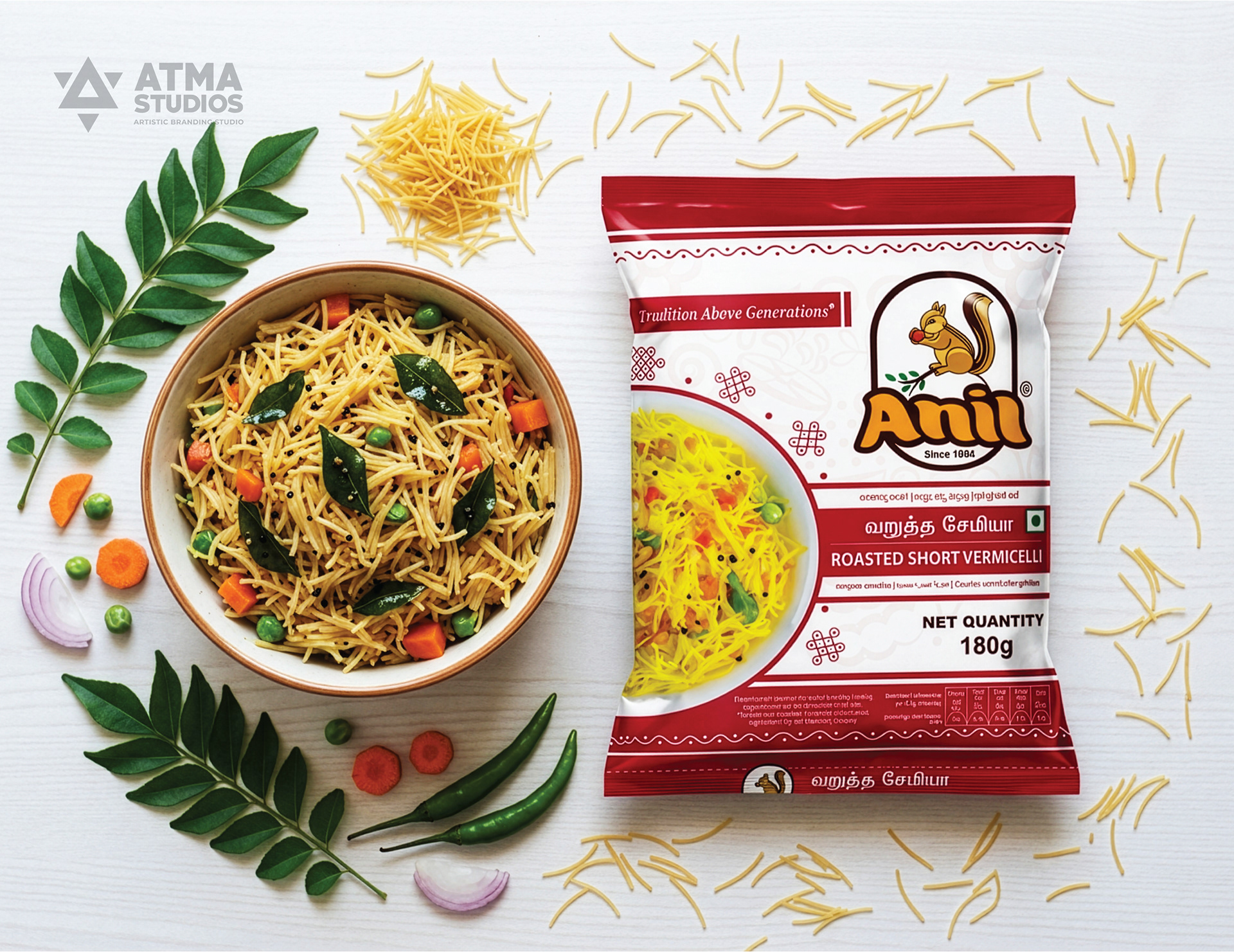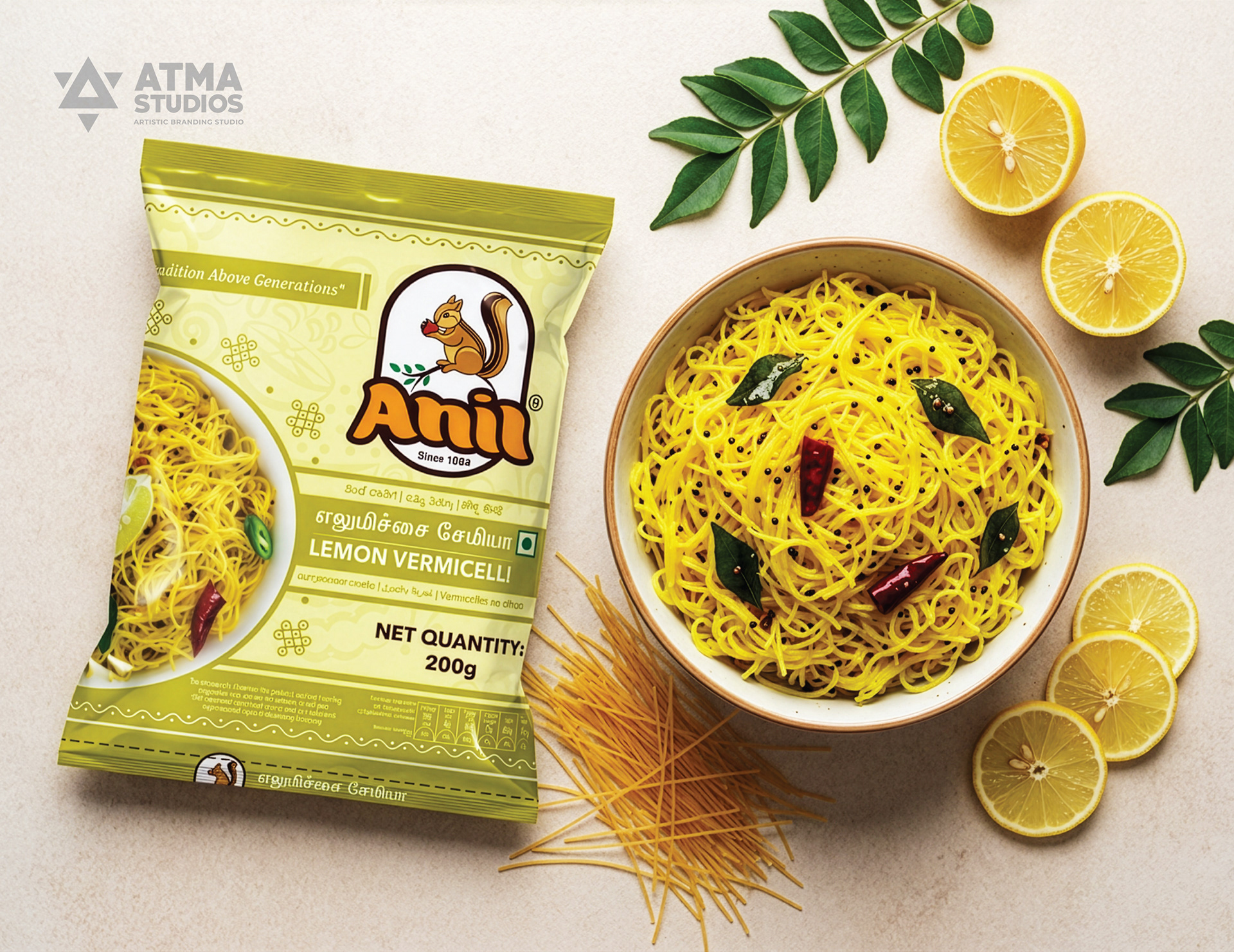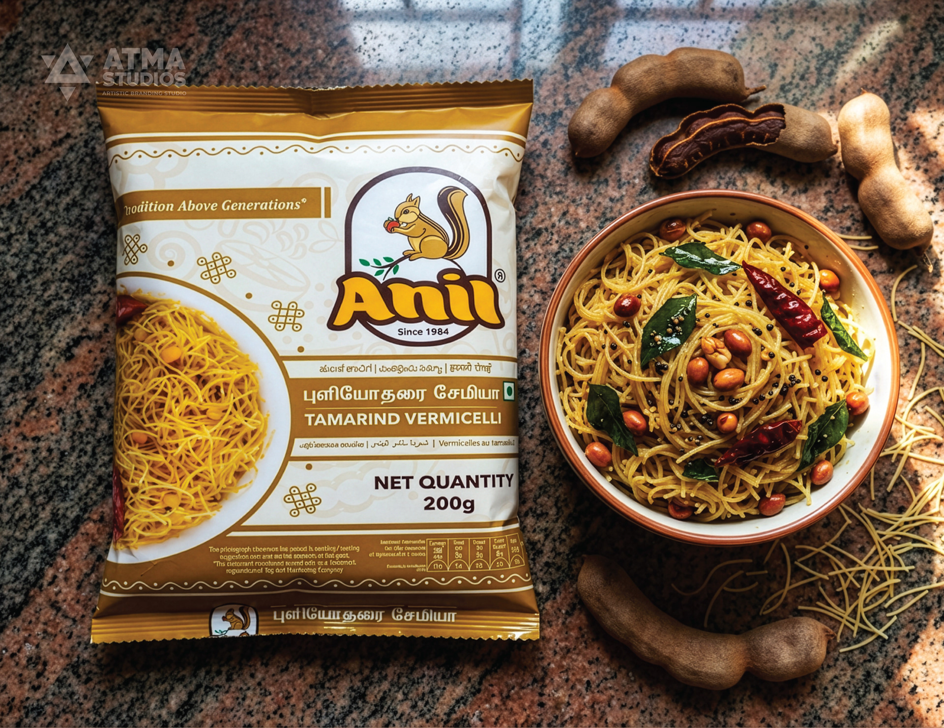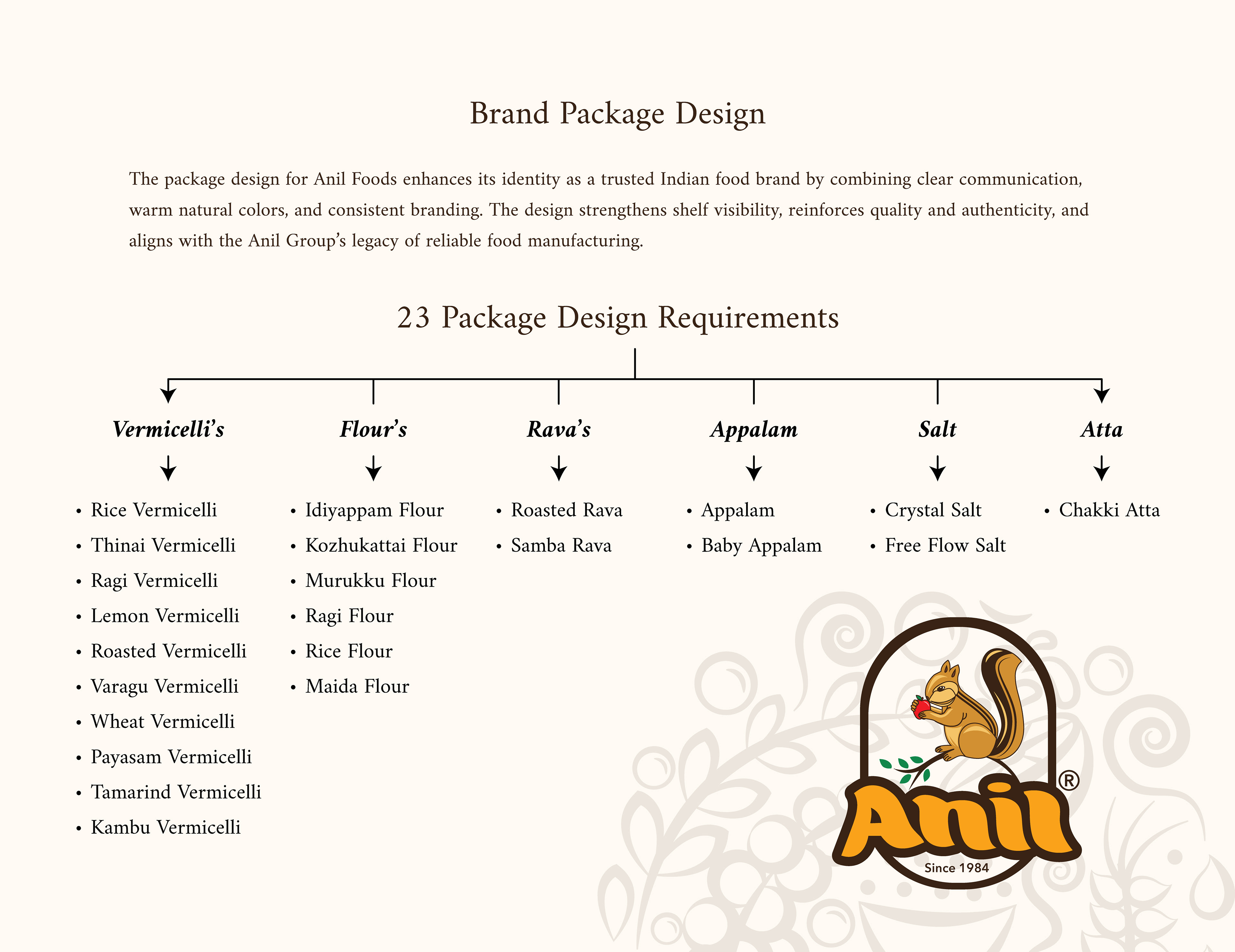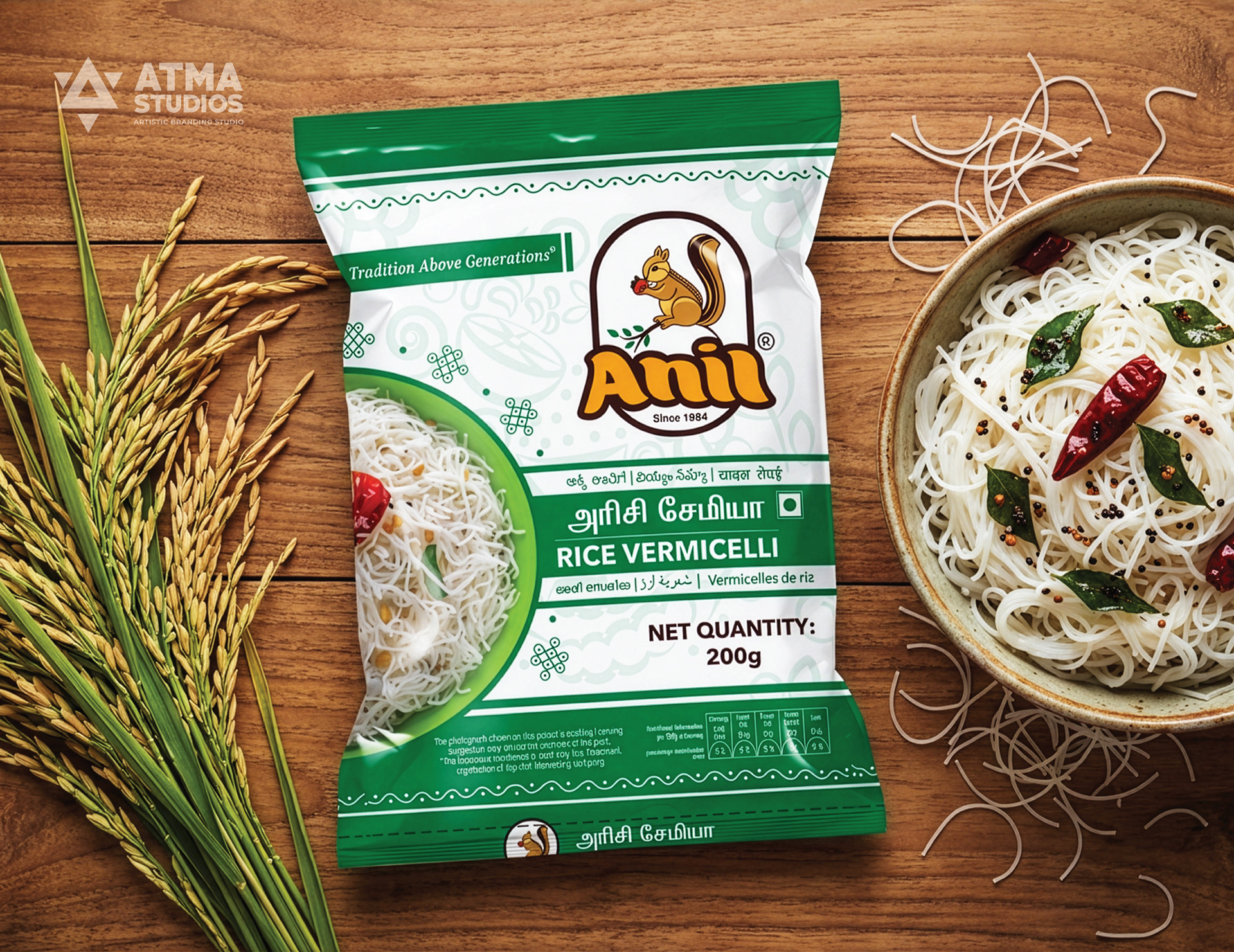 Anil Group is a beloved Indian FMCG brand rooted in tradition but thriving in modern kitchens since 1984. With a rich legacy of crafting wholesome, affordable and delicious food staples from vermicelli, rava and flour to noodles, appalam, salt and more, Anil has become a staple in households across South India and beyond, earning the trust of families and food lovers alike. For decades, Anil’s packaging has stood on shelves as a symbol of quality and reliability. In this project, we had the opportunity to reimagine the brand’s visual identity and overhaul 23 product packaging designs to better reflect the brand’s heritage while making it fresh, vibrant and contemporary for today’s consumers. Our redesign bridges tradition and modernity, celebrating Anil’s legacy while amplifying shelf presence and consumer appeal, bringing a timeless brand into a bold new era of FMCG design.