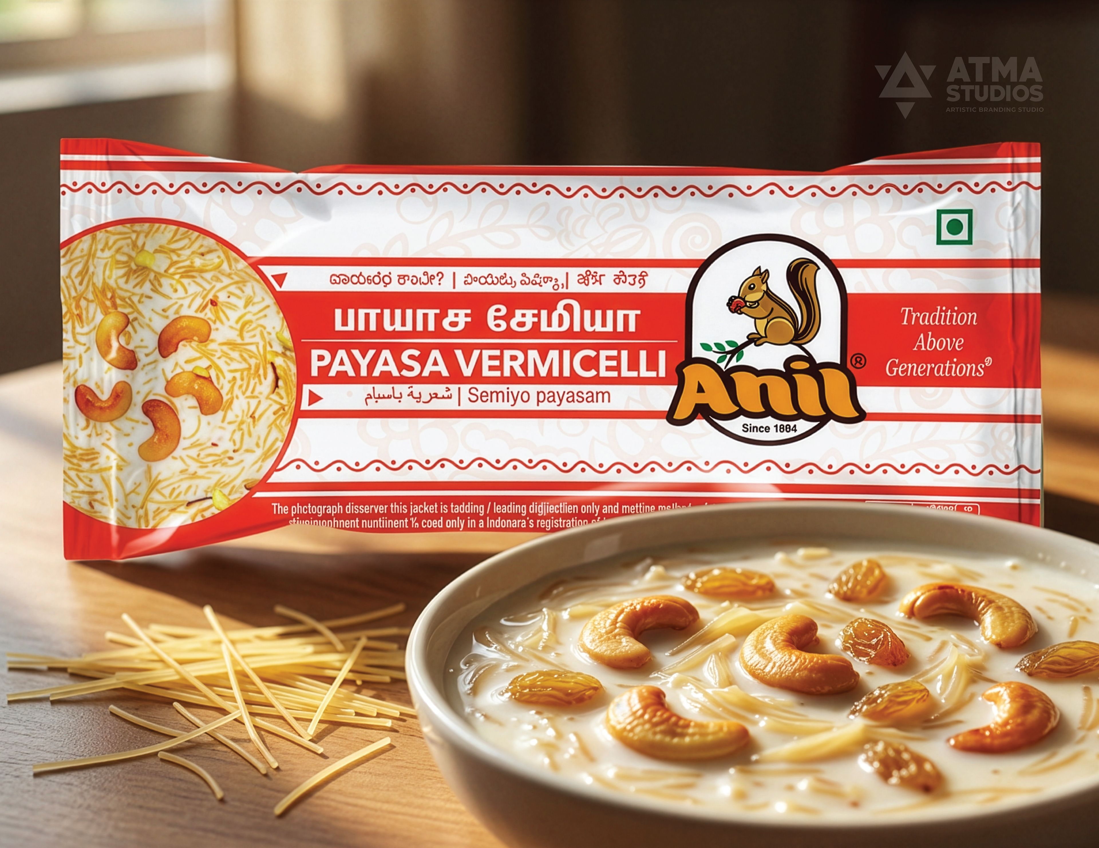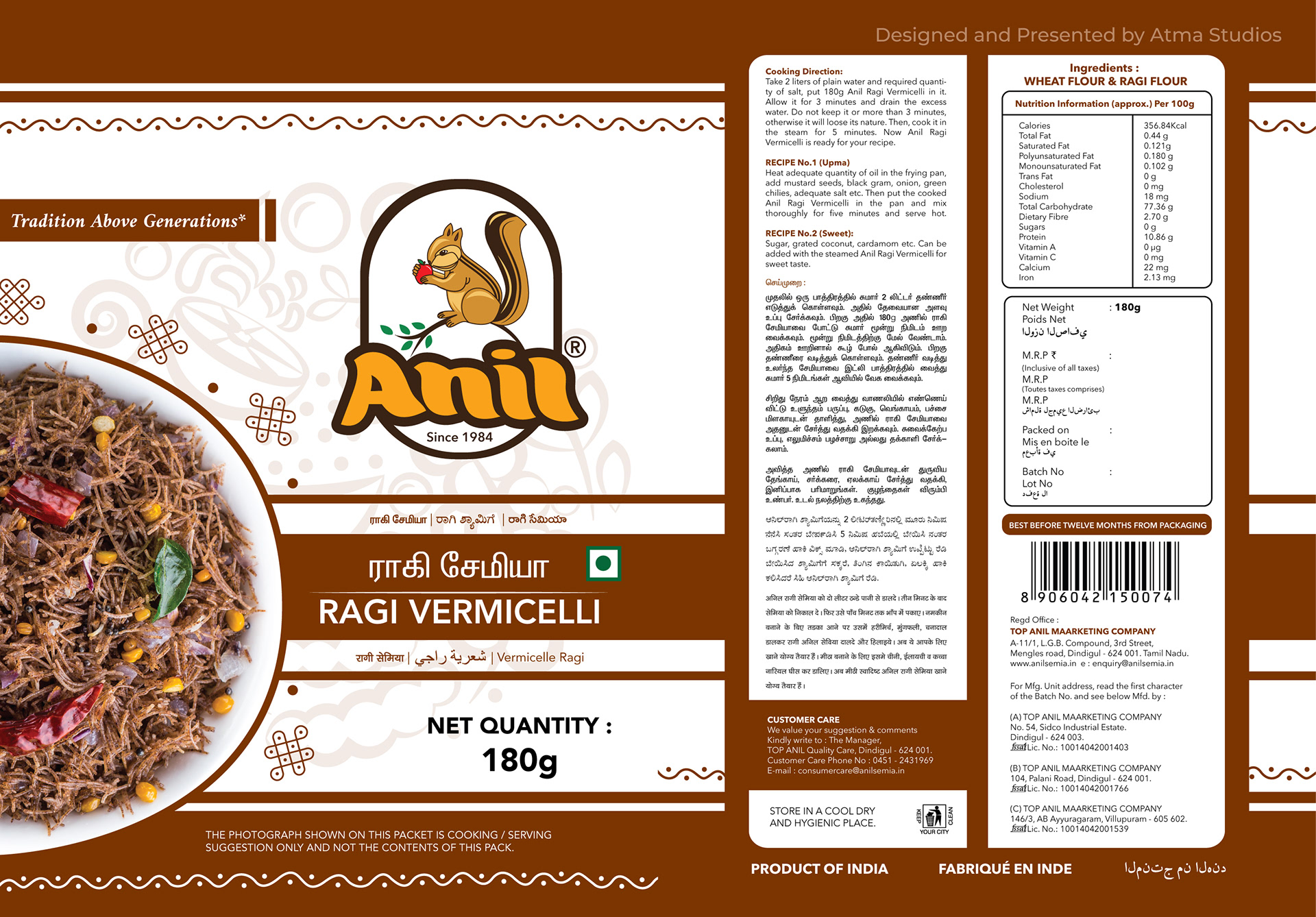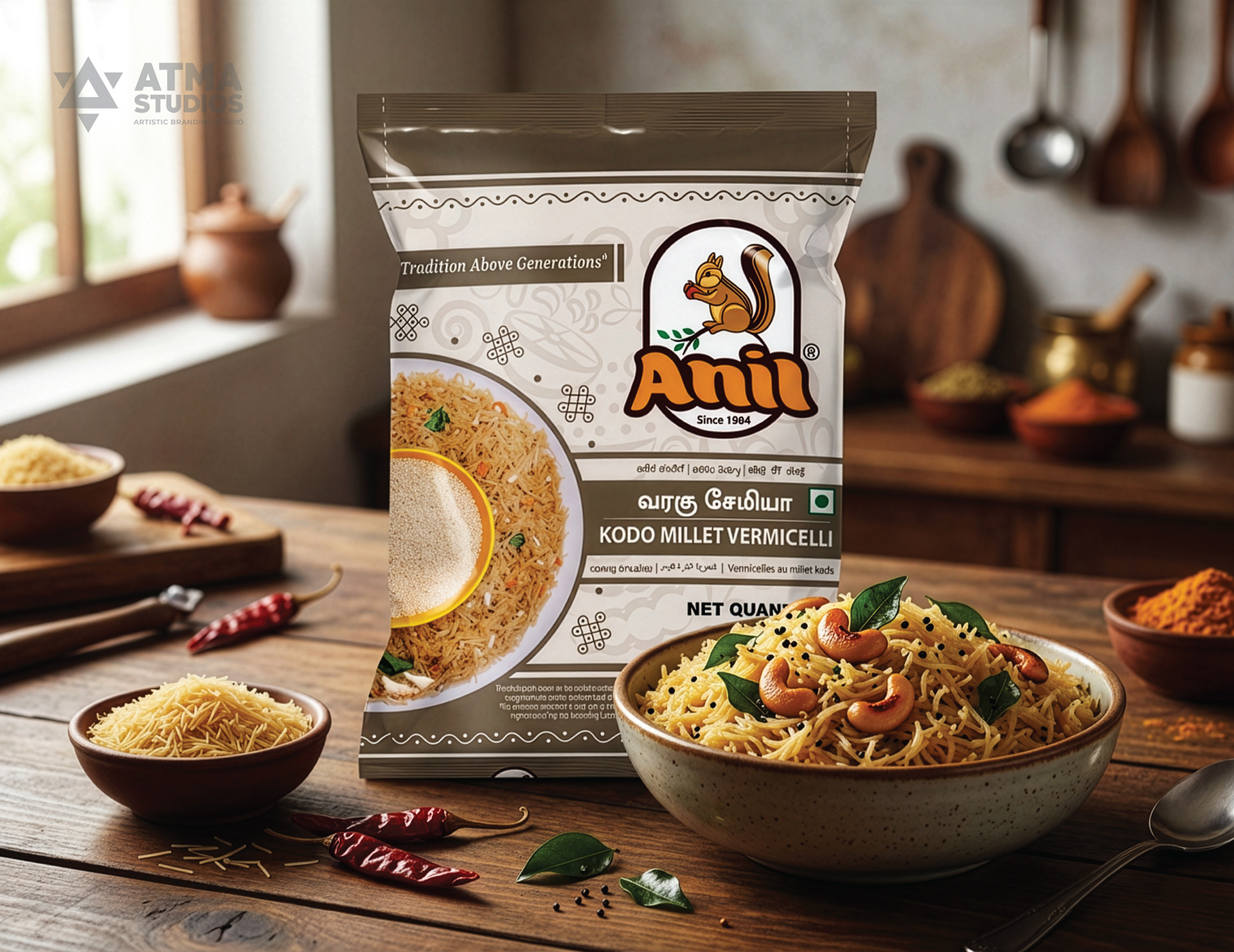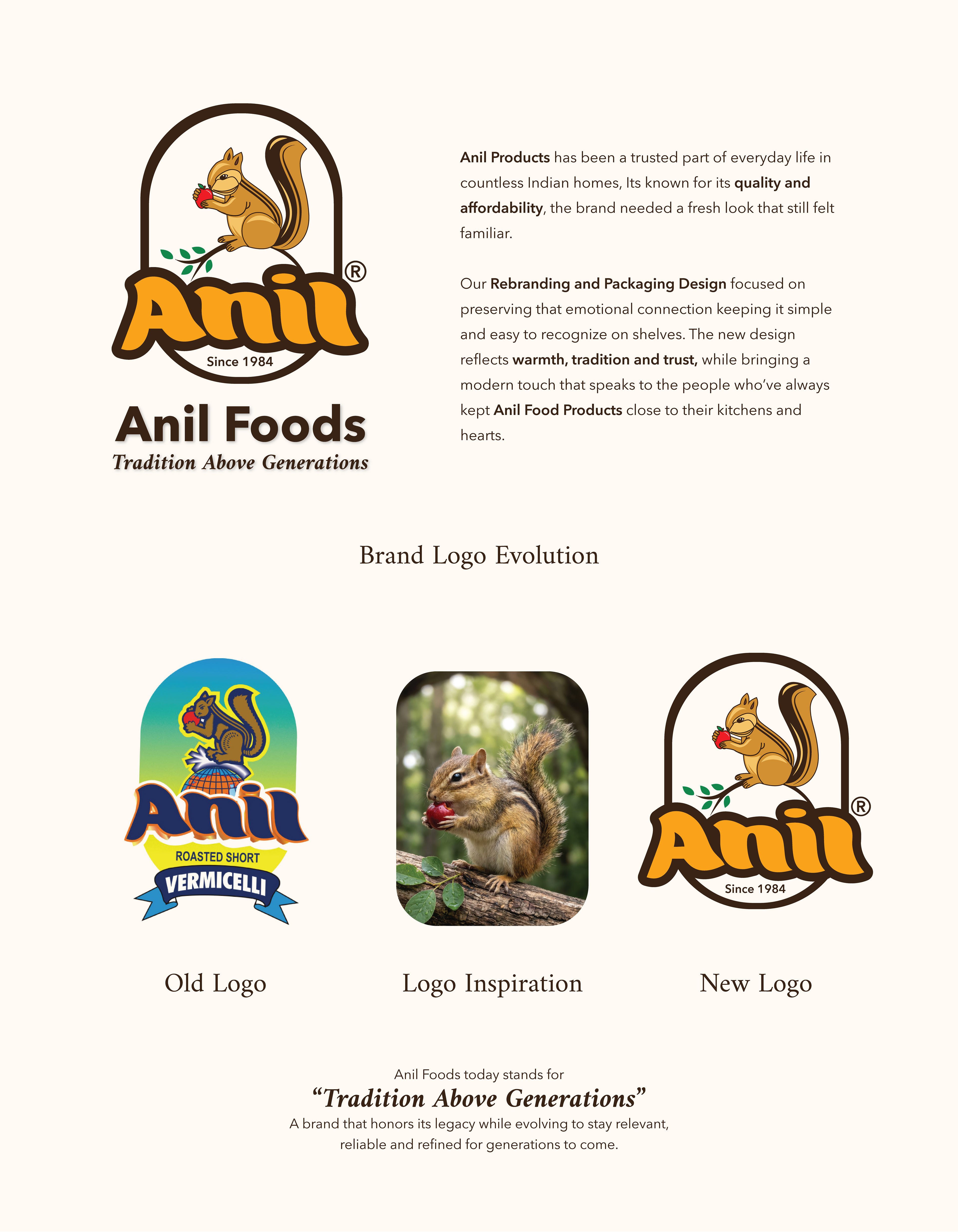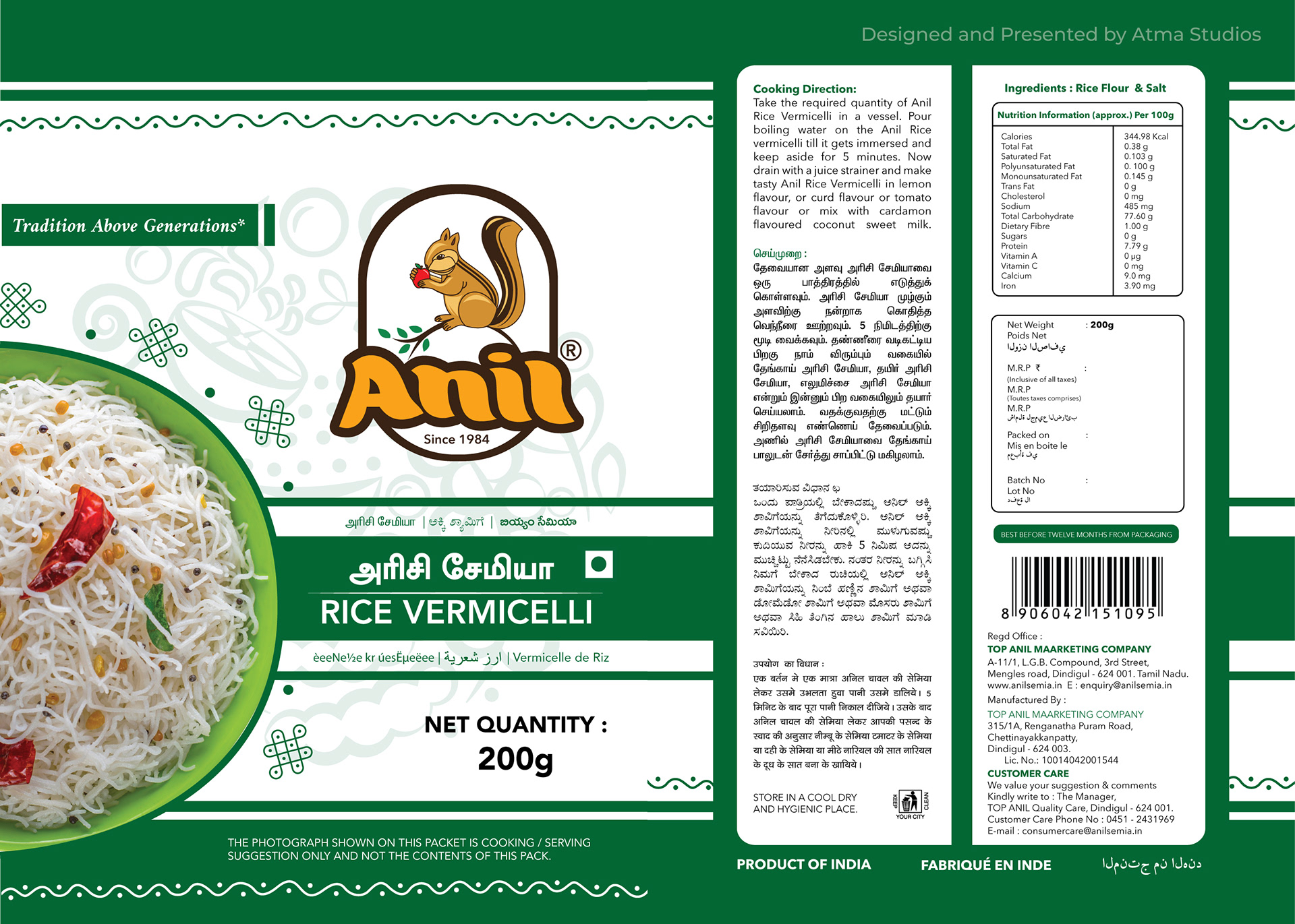 Anil Group is a beloved Indian FMCG brand rooted in tradition but thriving in modern kitchens since 1984. With a rich legacy of crafting wholesome, affordable and delicious food staples from vermicelli, rava and flour to noodles, appalam, salt and more, Anil has become a staple in households across South India and beyond, earning the trust of families and food lovers alike. For decades, Anil’s packaging has stood on shelves as a symbol of quality and reliability. In this project, we had the opportunity to reimagine the brand’s visual identity and overhaul 23 product packaging designs to better reflect the brand’s heritage while making it fresh, vibrant and contemporary for today’s consumers. Our redesign bridges tradition and modernity, celebrating Anil’s legacy while amplifying shelf presence and consumer appeal, bringing a timeless brand into a bold new era of FMCG design.