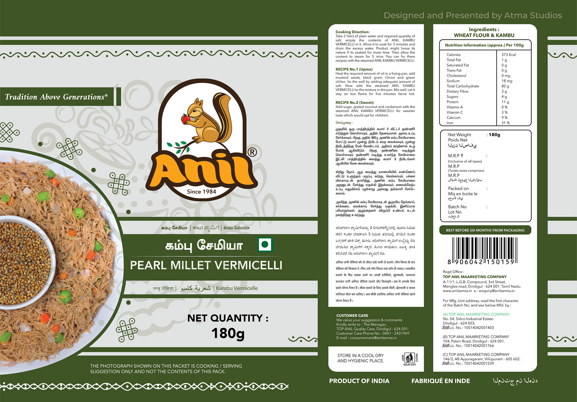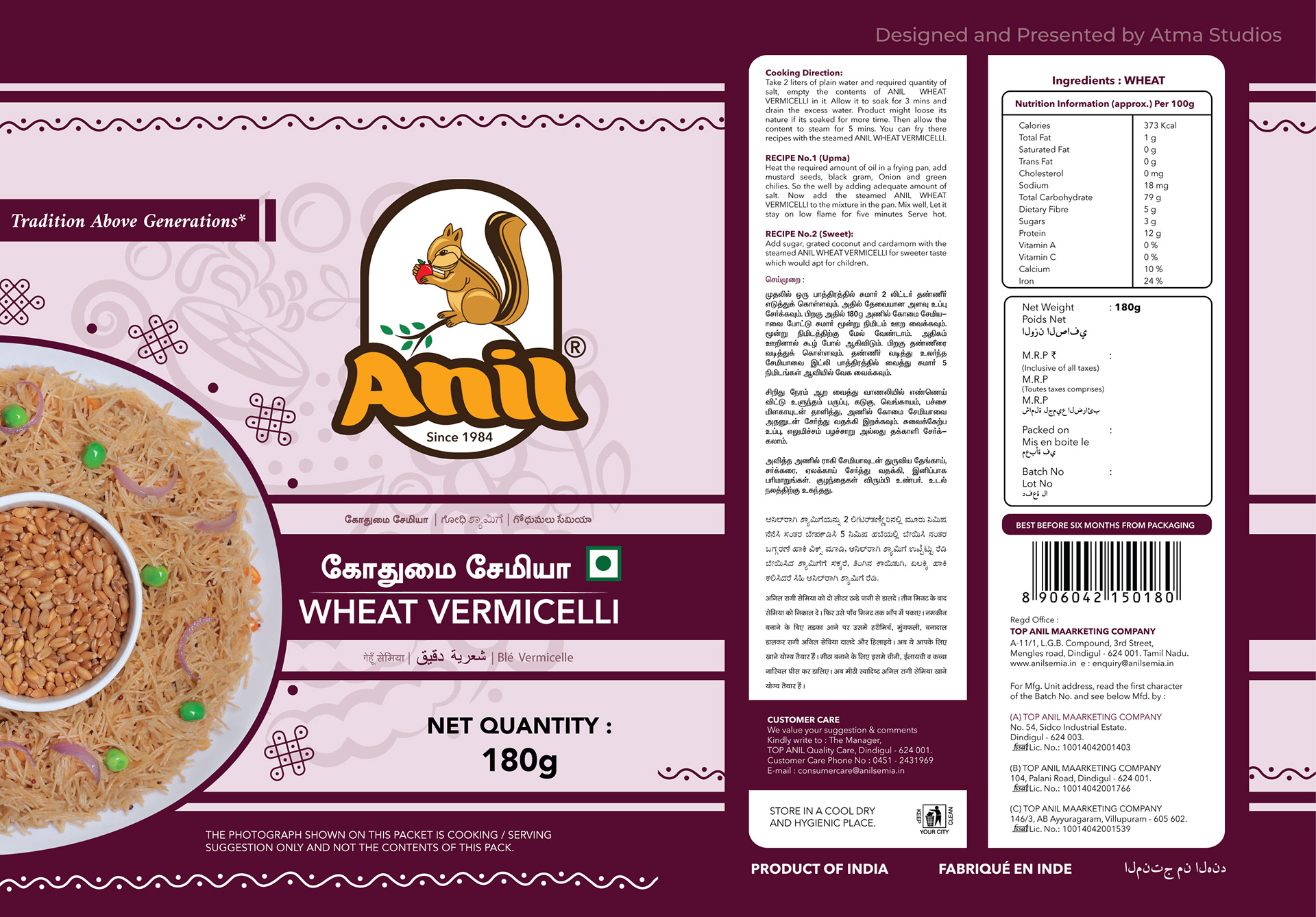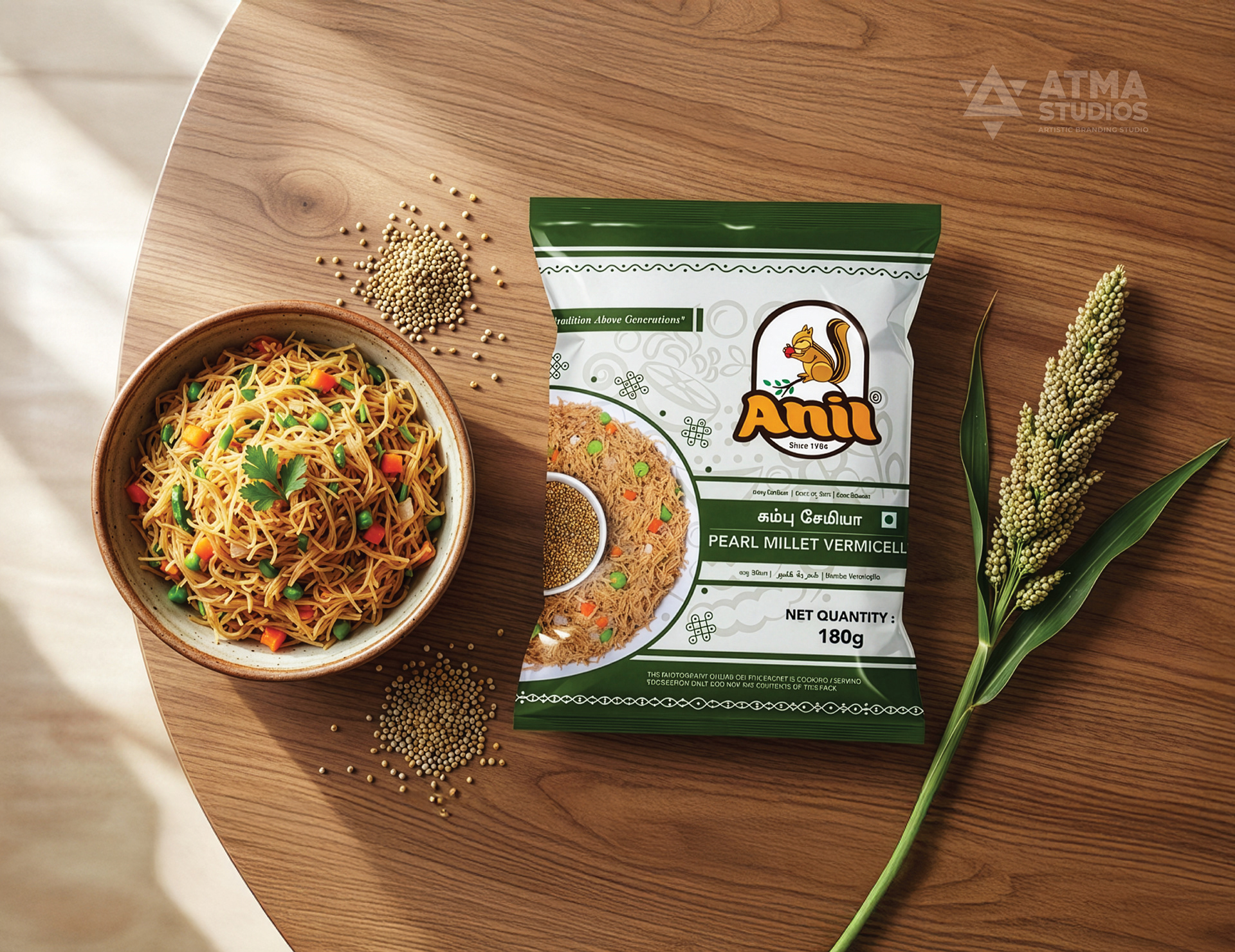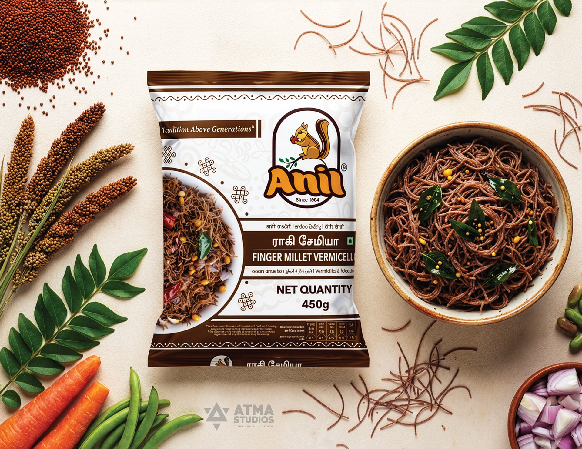 Anil Group is a beloved Indian FMCG brand rooted in tradition but thriving in modern kitchens since 1984. With a rich legacy of crafting wholesome, affordable and delicious food staples from vermicelli, rava and flour to noodles, appalam, salt and more, Anil has become a staple in households across South India and beyond, earning the trust of families and food lovers alike. For decades, Anil’s packaging has stood on shelves as a symbol of quality and reliability. In this project, we had the opportunity to reimagine the brand’s visual identity and overhaul 23 product packaging designs to better reflect the brand’s heritage while making it fresh, vibrant and contemporary for today’s consumers. Our redesign bridges tradition and modernity, celebrating Anil’s legacy while amplifying shelf presence and consumer appeal, bringing a timeless brand into a bold new era of FMCG design.