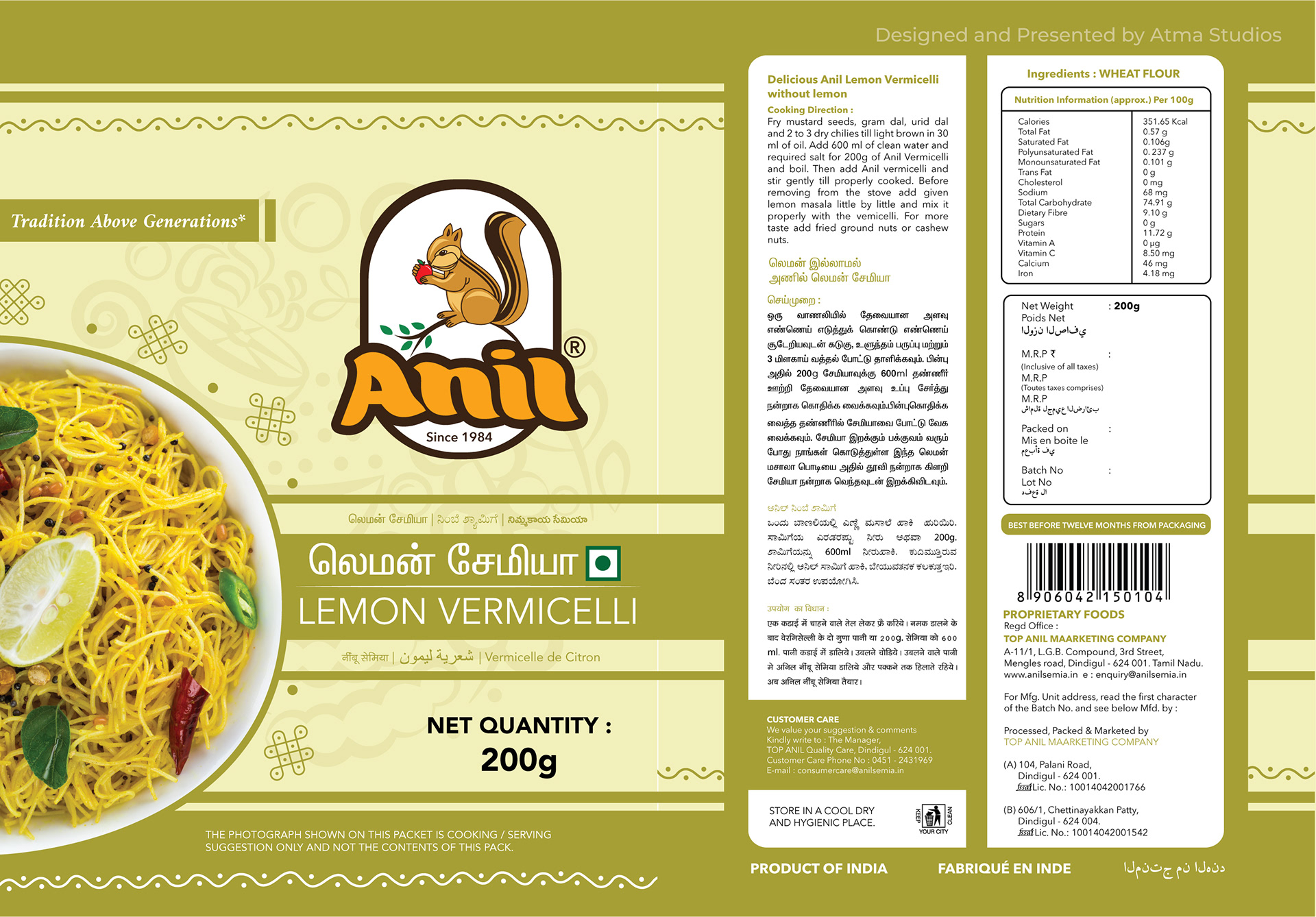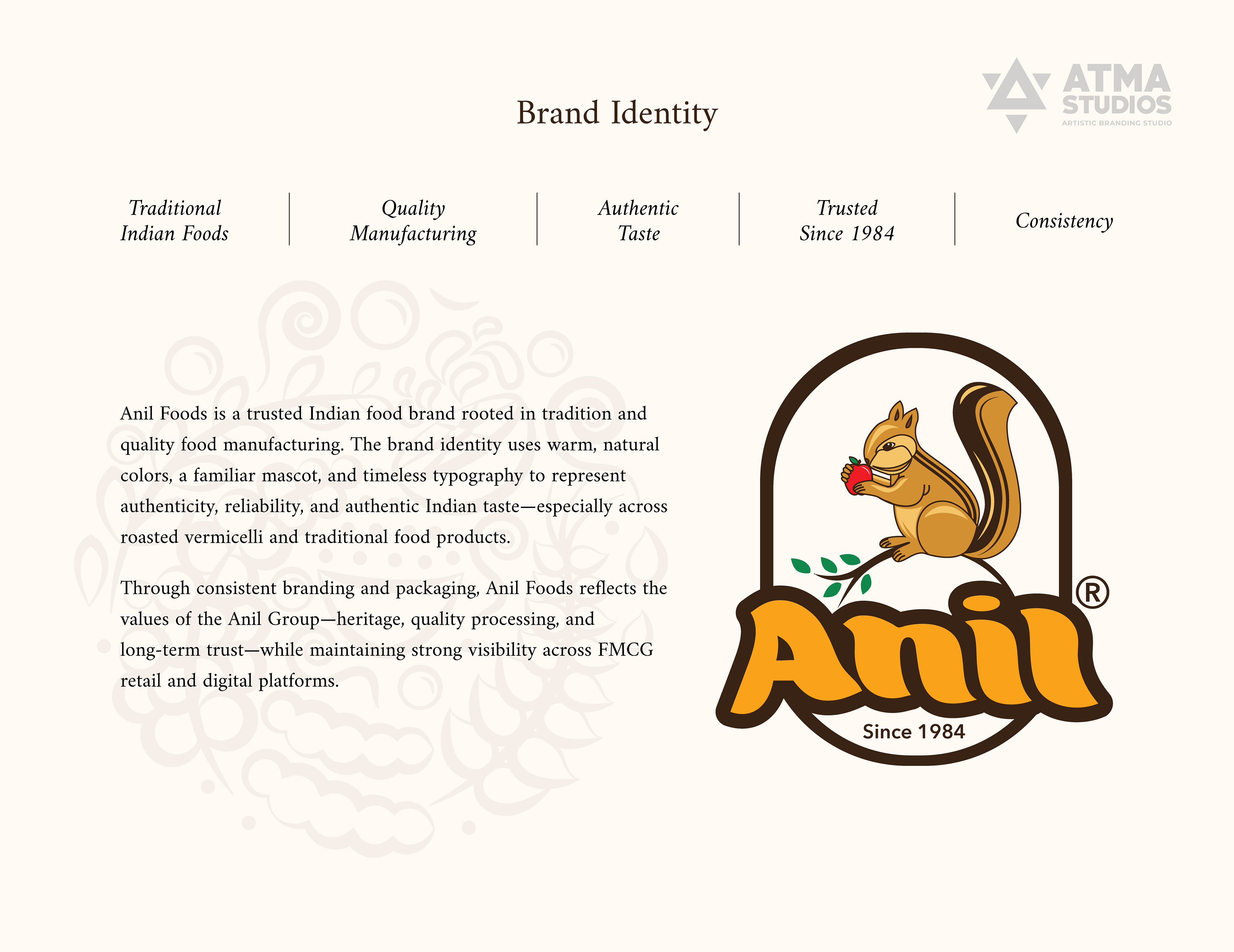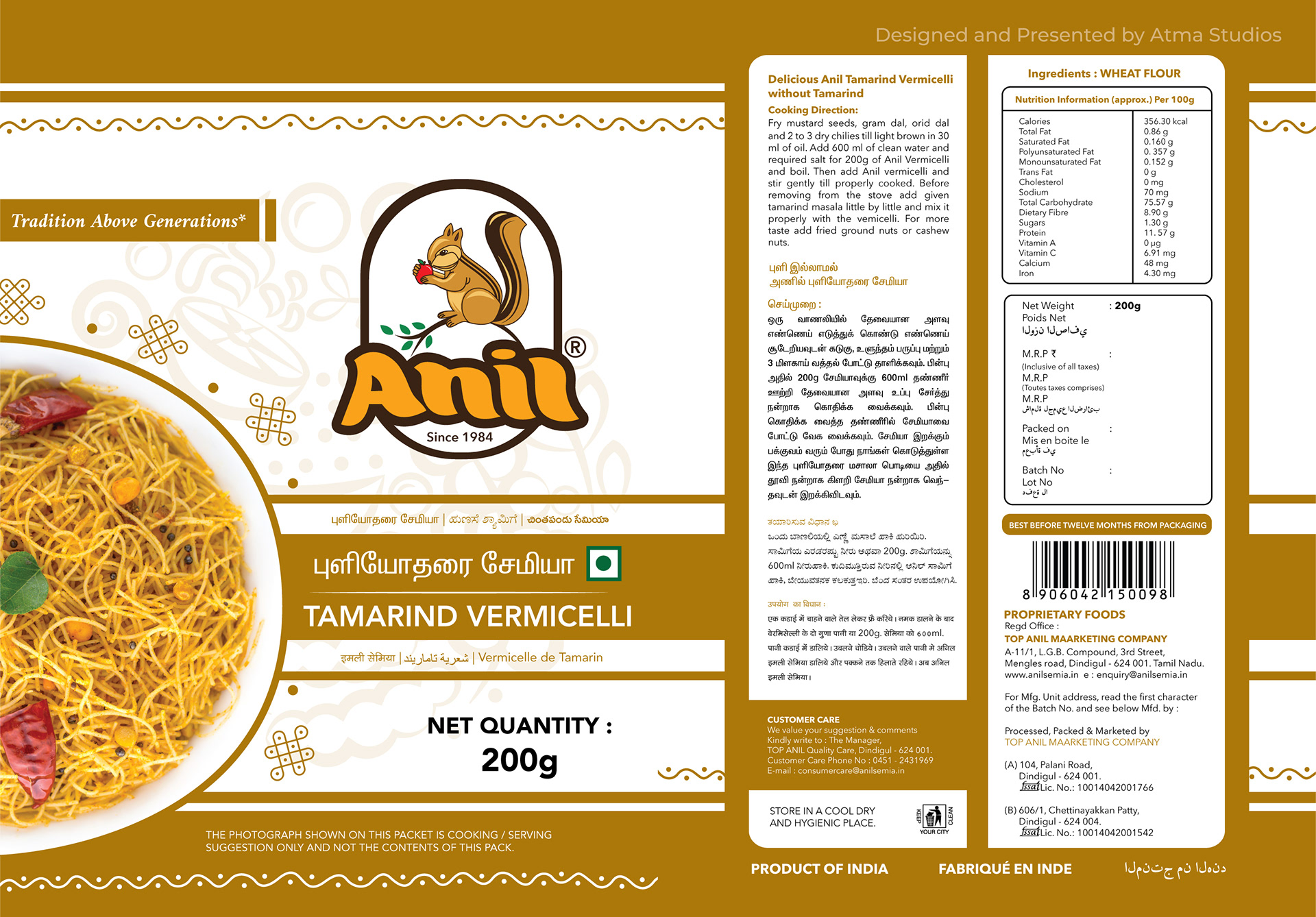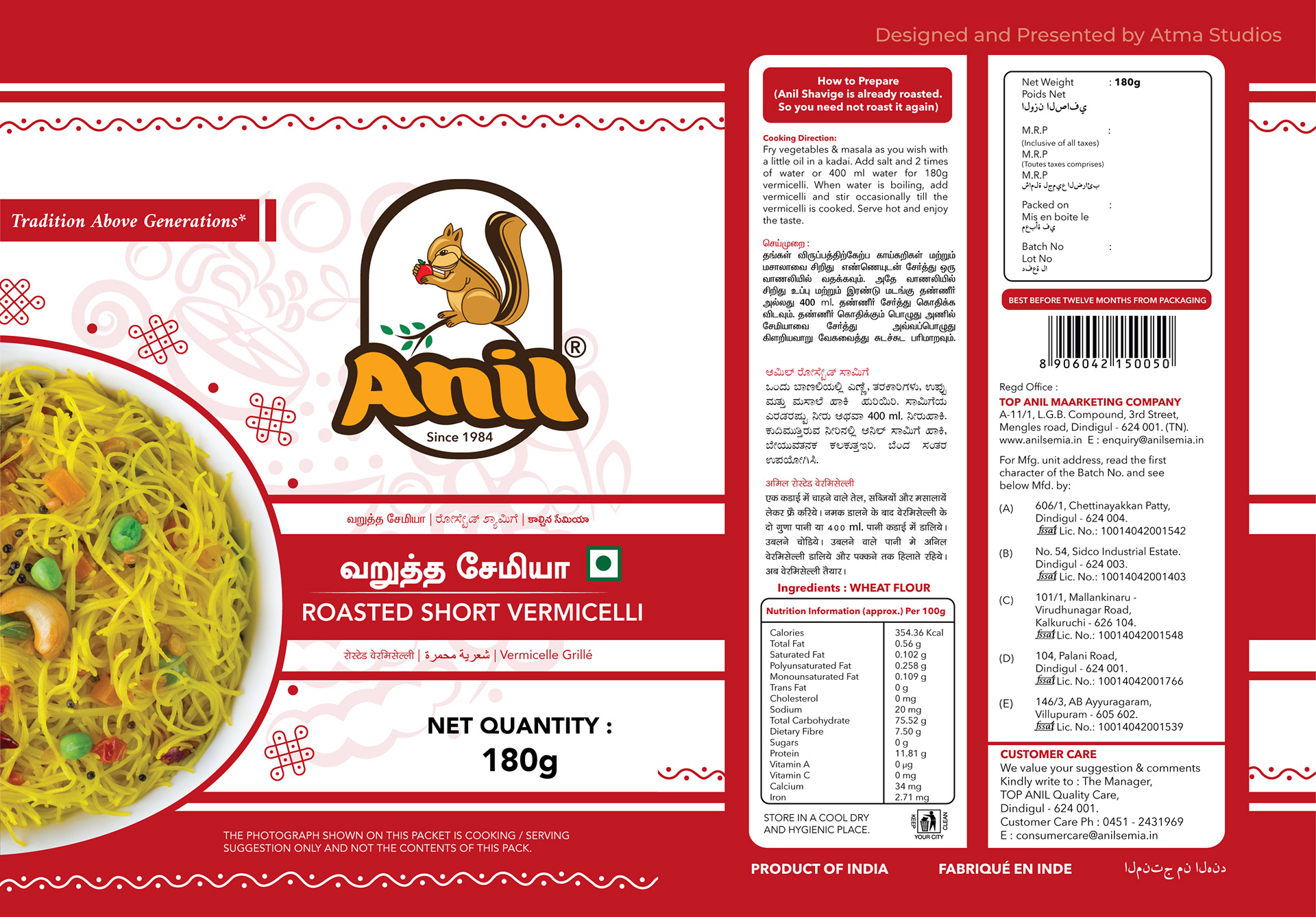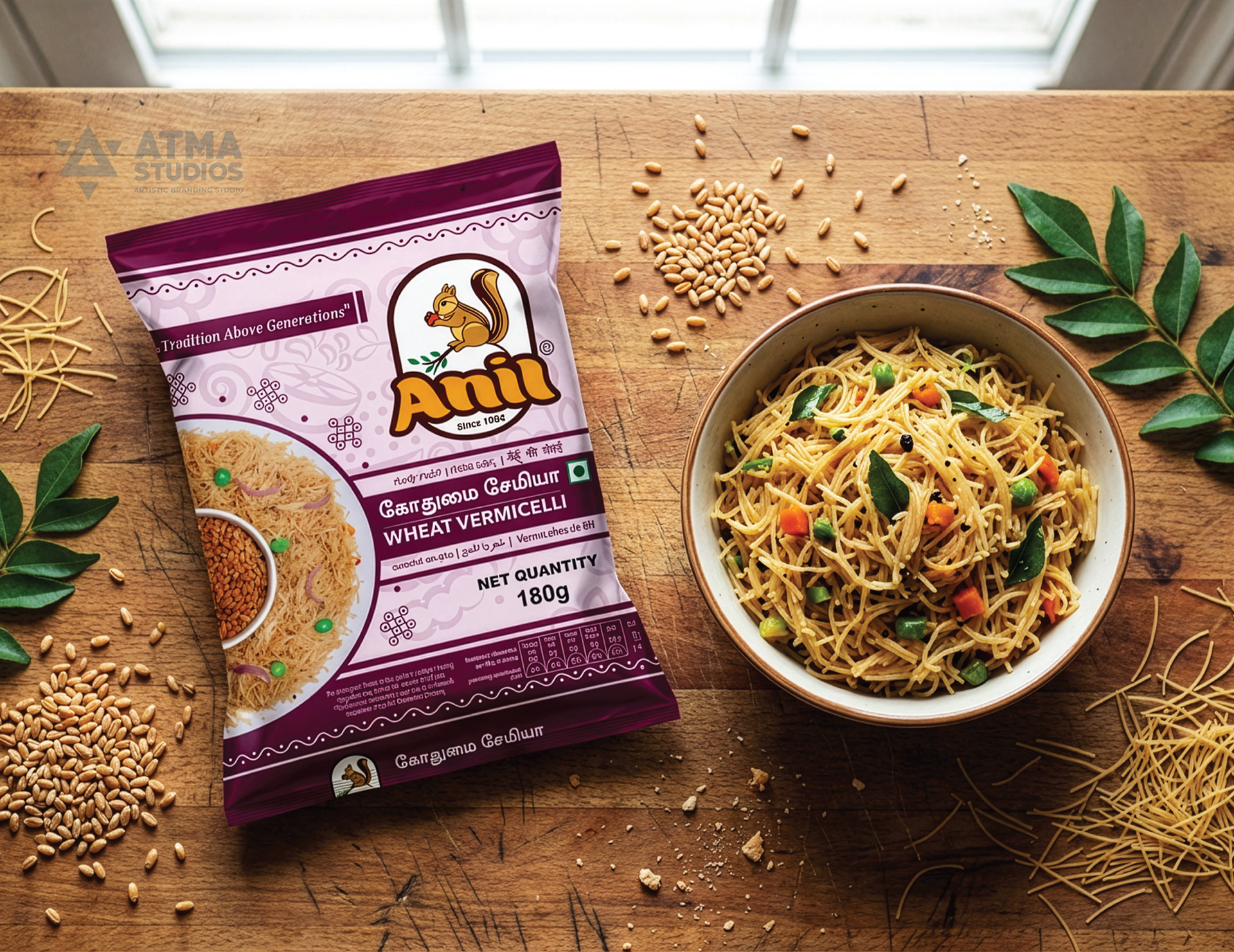 Anil Group is a beloved Indian FMCG brand rooted in tradition but thriving in modern kitchens since 1984. With a rich legacy of crafting wholesome, affordable and delicious food staples from vermicelli, rava and flour to noodles, appalam, salt and more, Anil has become a staple in households across South India and beyond, earning the trust of families and food lovers alike. For decades, Anil’s packaging has stood on shelves as a symbol of quality and reliability. In this project, we had the opportunity to reimagine the brand’s visual identity and overhaul 23 product packaging designs to better reflect the brand’s heritage while making it fresh, vibrant and contemporary for today’s consumers. Our redesign bridges tradition and modernity, celebrating Anil’s legacy while amplifying shelf presence and consumer appeal, bringing a timeless brand into a bold new era of FMCG design.