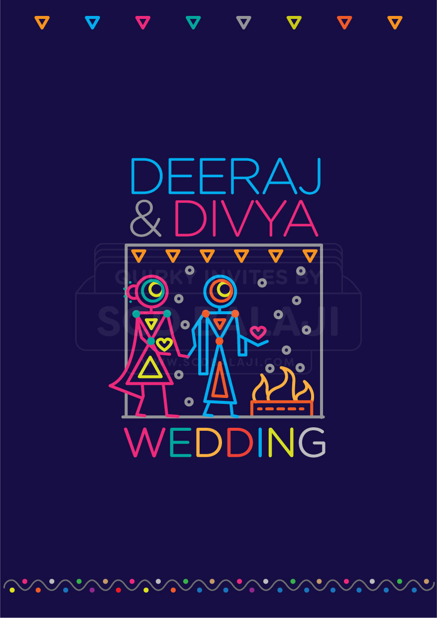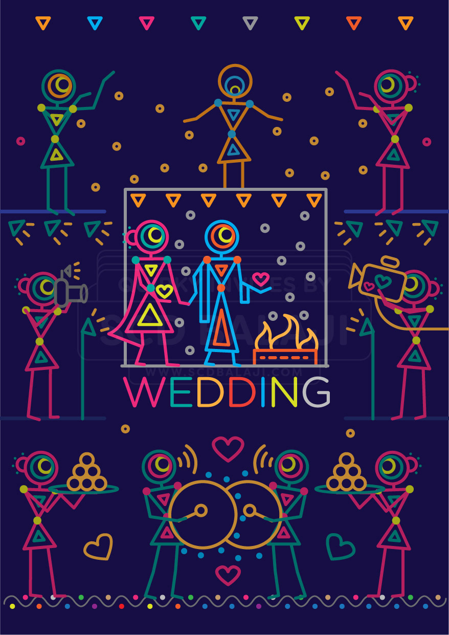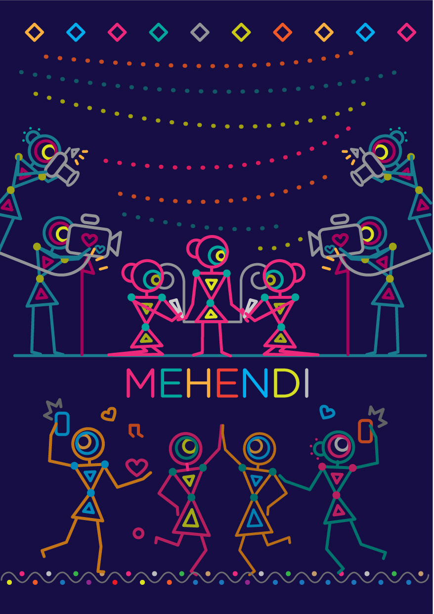 “ Unleash the power of geometry for your wedding invite “ This unique invite’s illustration style is based on Ancient Indian Iconography found in Warli, Folk Art of India. You will be surprised by the power of basic geometric shapes - circle, triangle, square which are aplenty in this invite portraying the variety of events in your big wedding. The illustrations are sure to put a smile on the faces of your dear guests. Thank us later. Indian Weddings are not just about the wedding day. It also features Engagement, Sangeet, Mehendi, Reception that play a major part in bringing happiness to all the people around you. Choose this Indian wedding invitation suite that covers it all in one go.