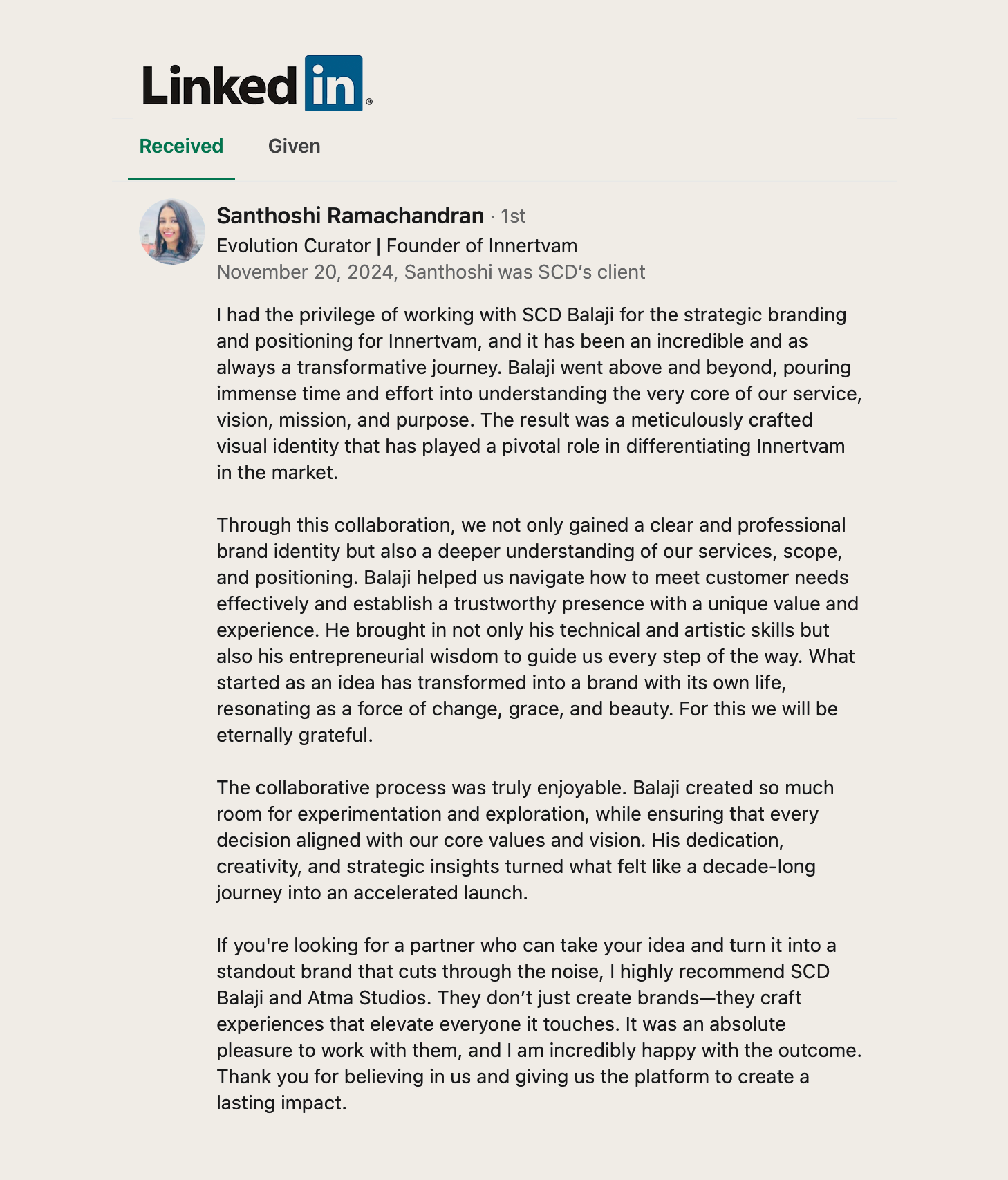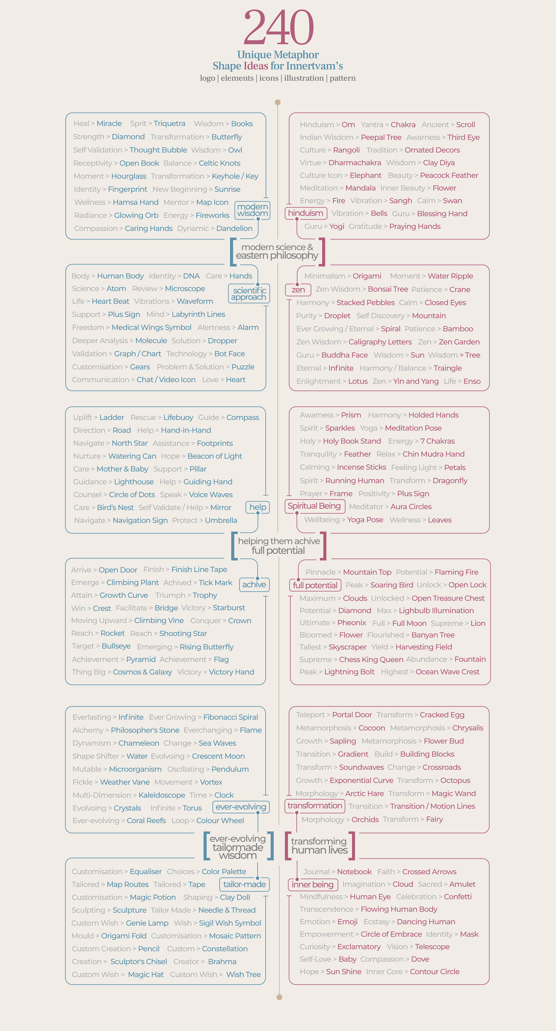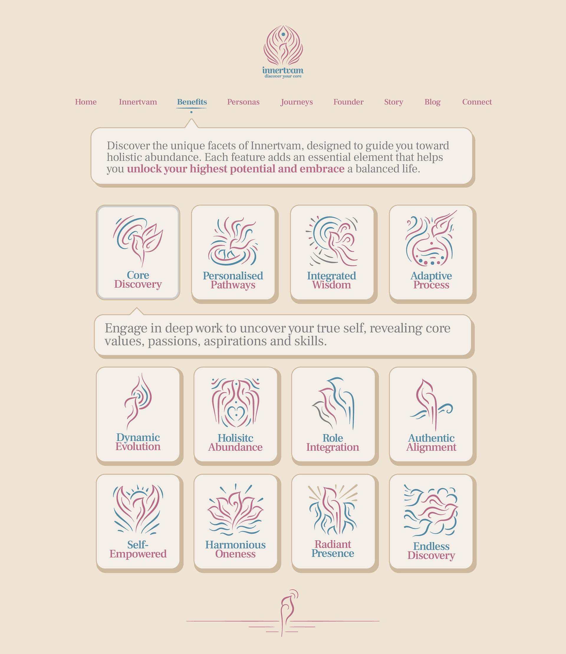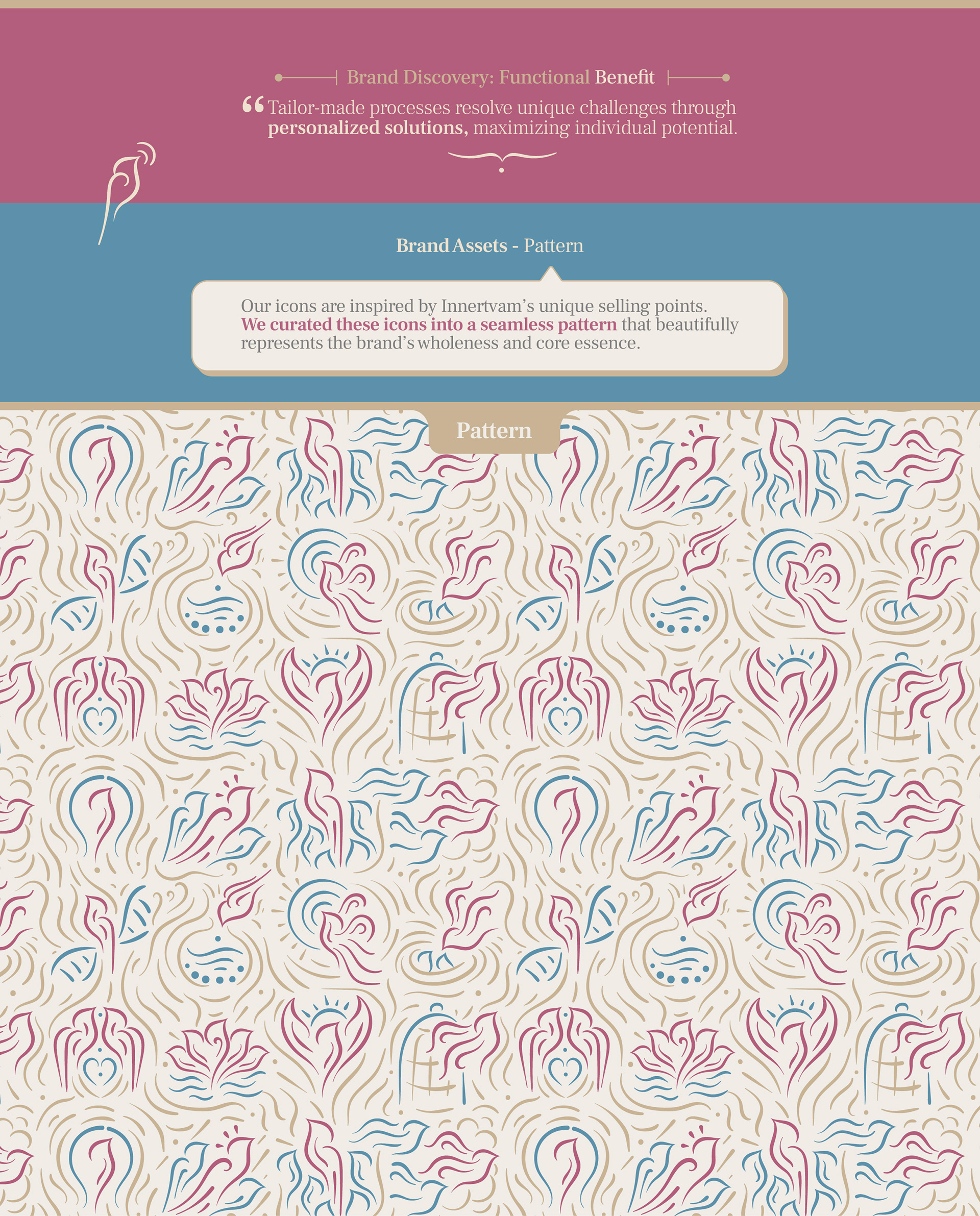 Innertvam is a life transformation program, and this project showcases a 360° brand identity design crafted to reflect its vision and purpose. The process began with brand discovery and blueprinting, laying a strong foundation for a cohesive and meaningful brand. We then developed a range of brand assets, including the logo, brand elements, color palette, typography, icons, illustrations, patterns, and illustrative lettering. Additionally, the project covered brand communication through the design of business stationery, UI/UX assets, social media templates, and photography and videography guidelines. This artistic and comprehensive identity design captures the essence of Innertvam, creating a brand that resonates with its transformative mission.