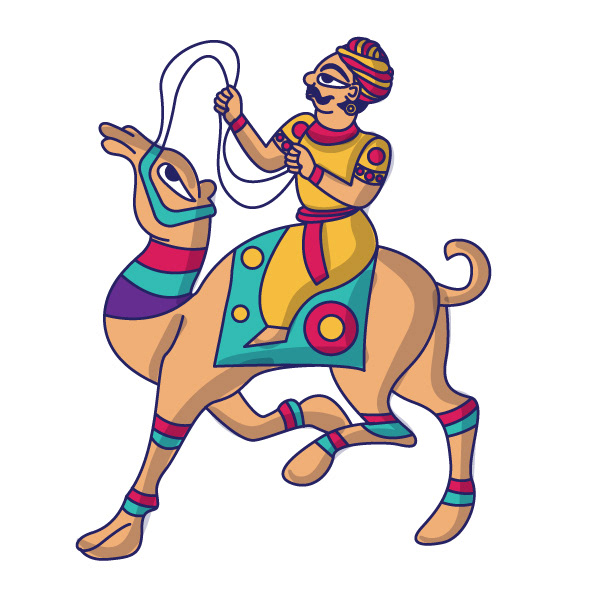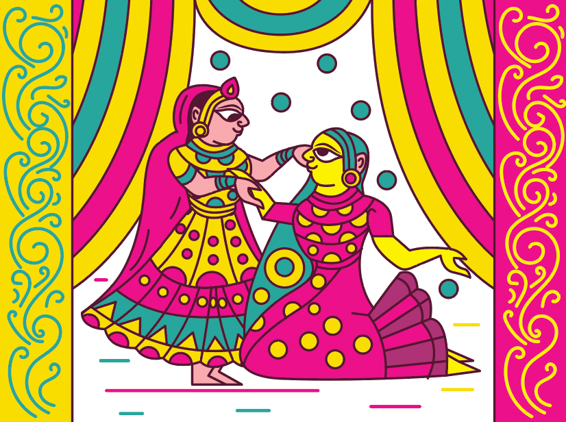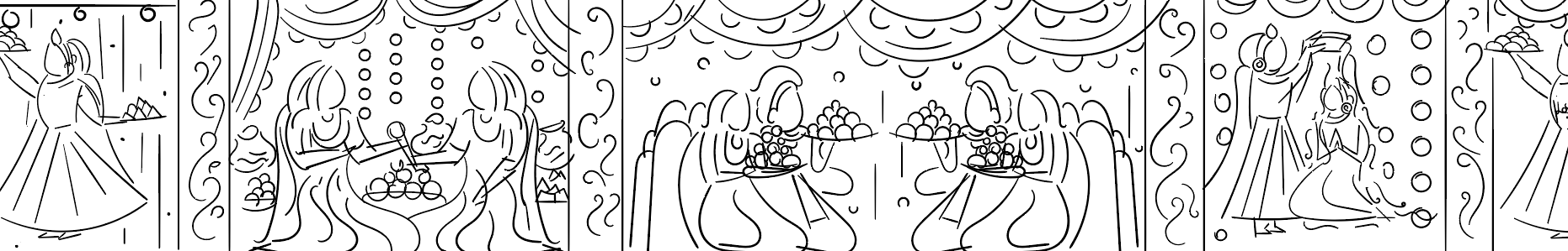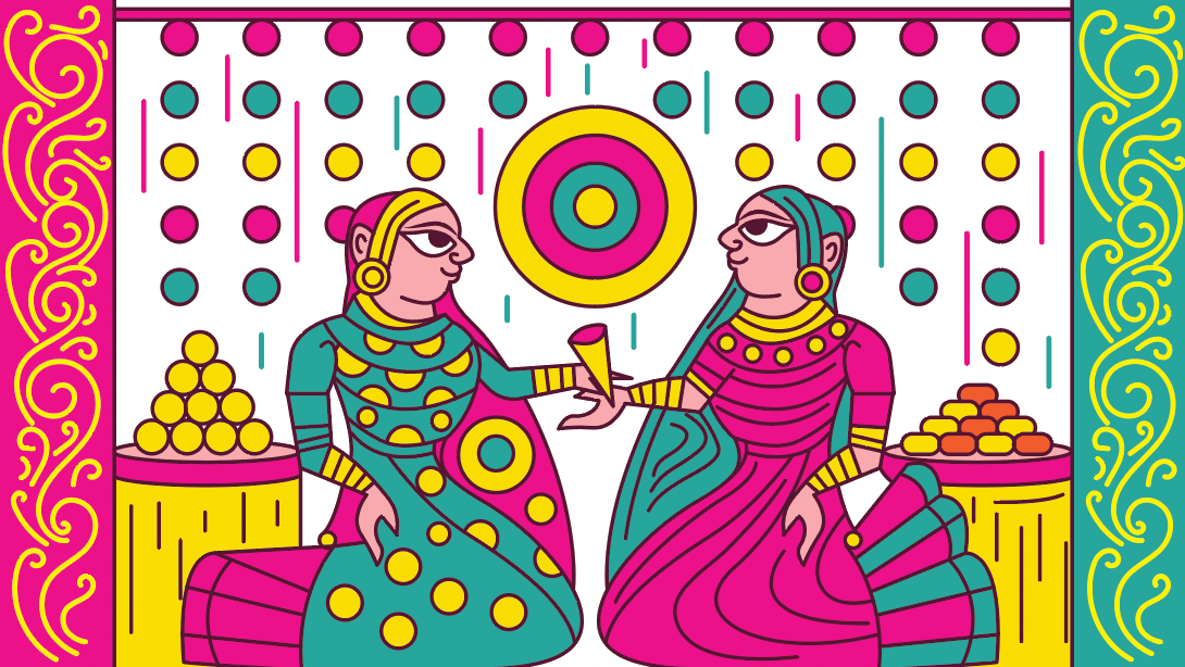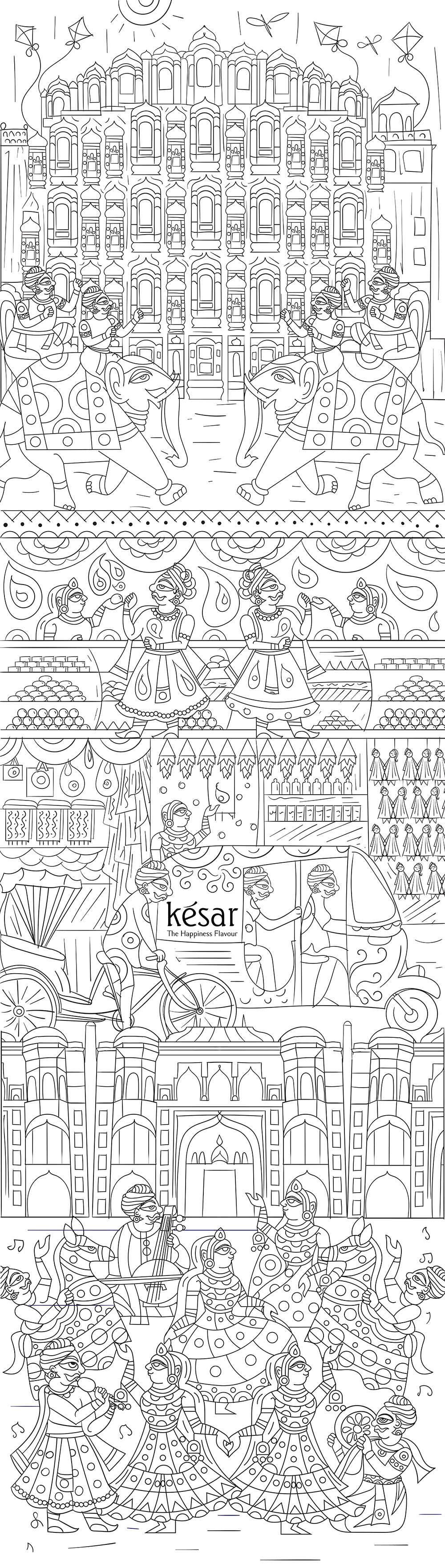 Digital wall mural illustrations of sweets in Indian weddings and events inspired by Rajasthani Phad Paintings for Kesar, a mithai boutique in Jaipur, has a long history of serving gourmet sweets worldwide.