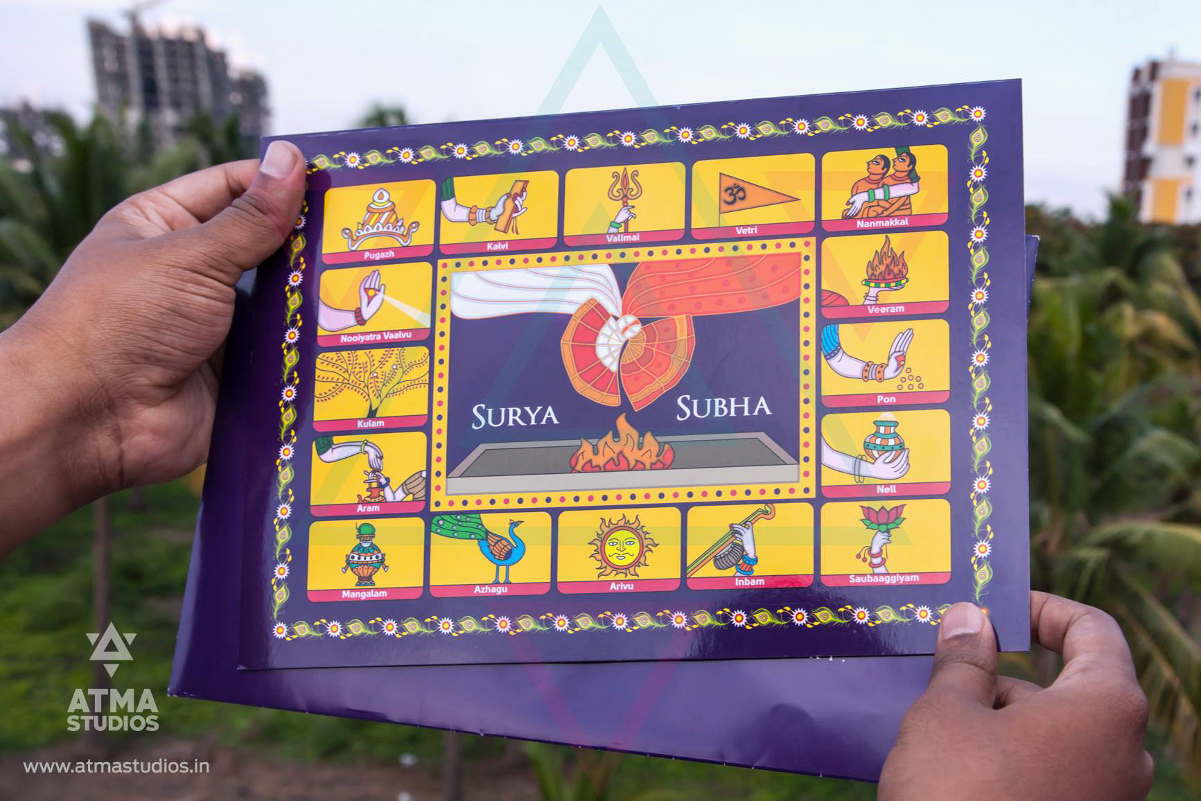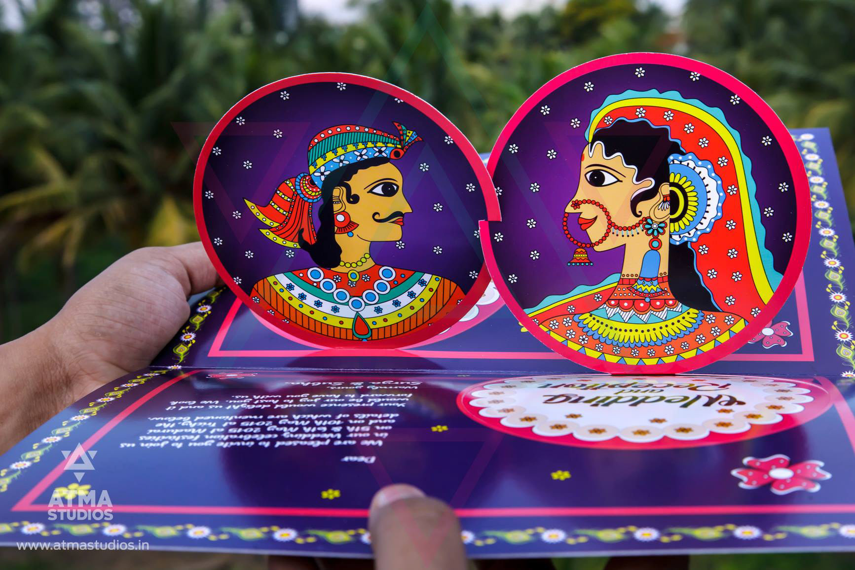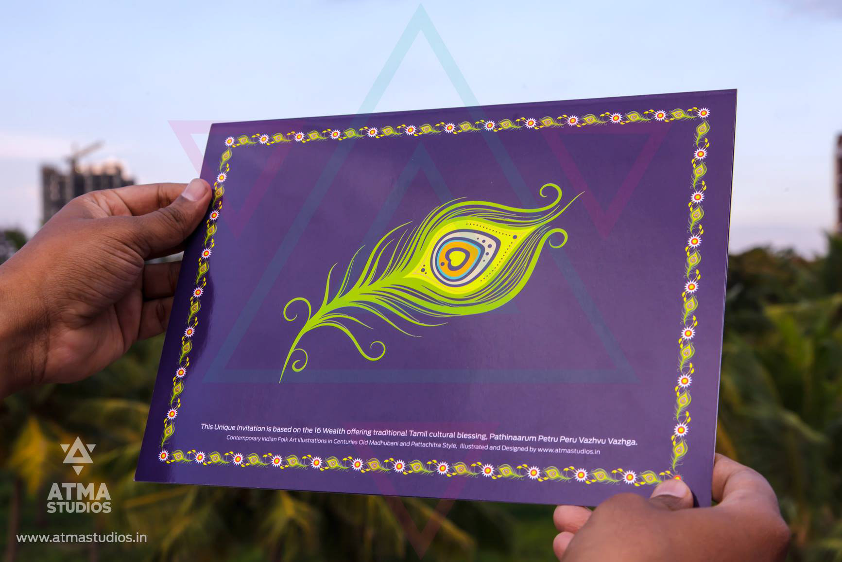 " 16 Blessings is all you need for a complete life “ This classic card’s design is inspired from contemporary Indian folk art illustration style found in Madhubani and Pattachitra art forms which are many centuries old. This invite depicts the 16 wealths that will be bestowed on the couple by the elders during the wedding time. This is as per our Tamil cultural blessing that says “Pathinaarum Peru Vazhvu Vaazhga “ The 16 wealths are individually illustrated and they are Fame, Knowledge, Strength, Success, Progeny, Courage, Finance, Abundance of food, Well-being, Enjoyment of Pleasures, Wisdom, Beauty, Unending Honours, Philanthropy, Birth (Lineage) and Healthy long life. Inviting your guests with this culturally rich card is a great sign in itself. The invite opens to a beautiful illustration of a bride and the groom on the inside. This is a classic wedding invite for your traditional wedding.