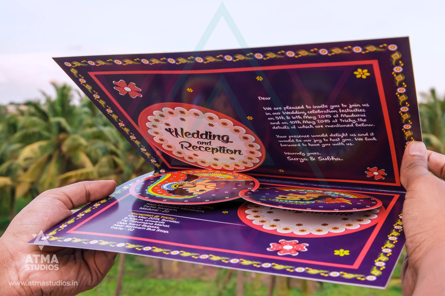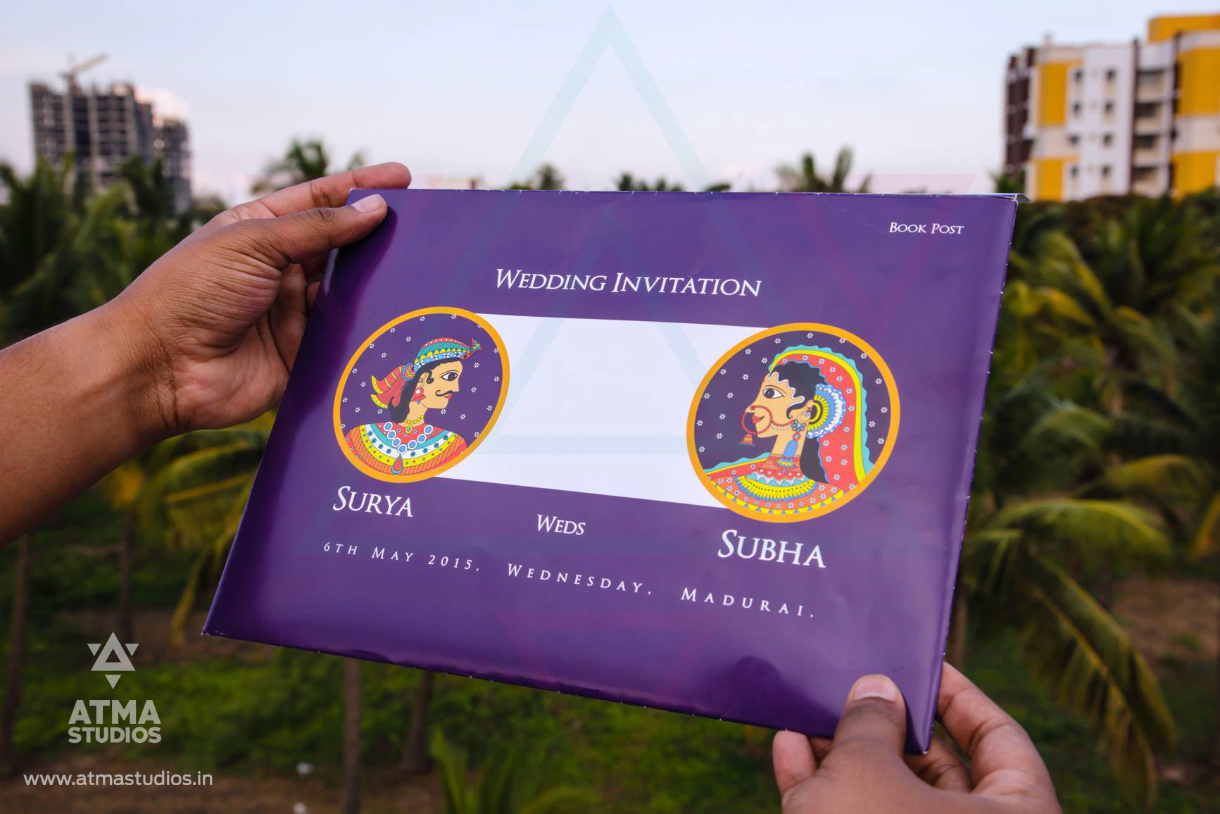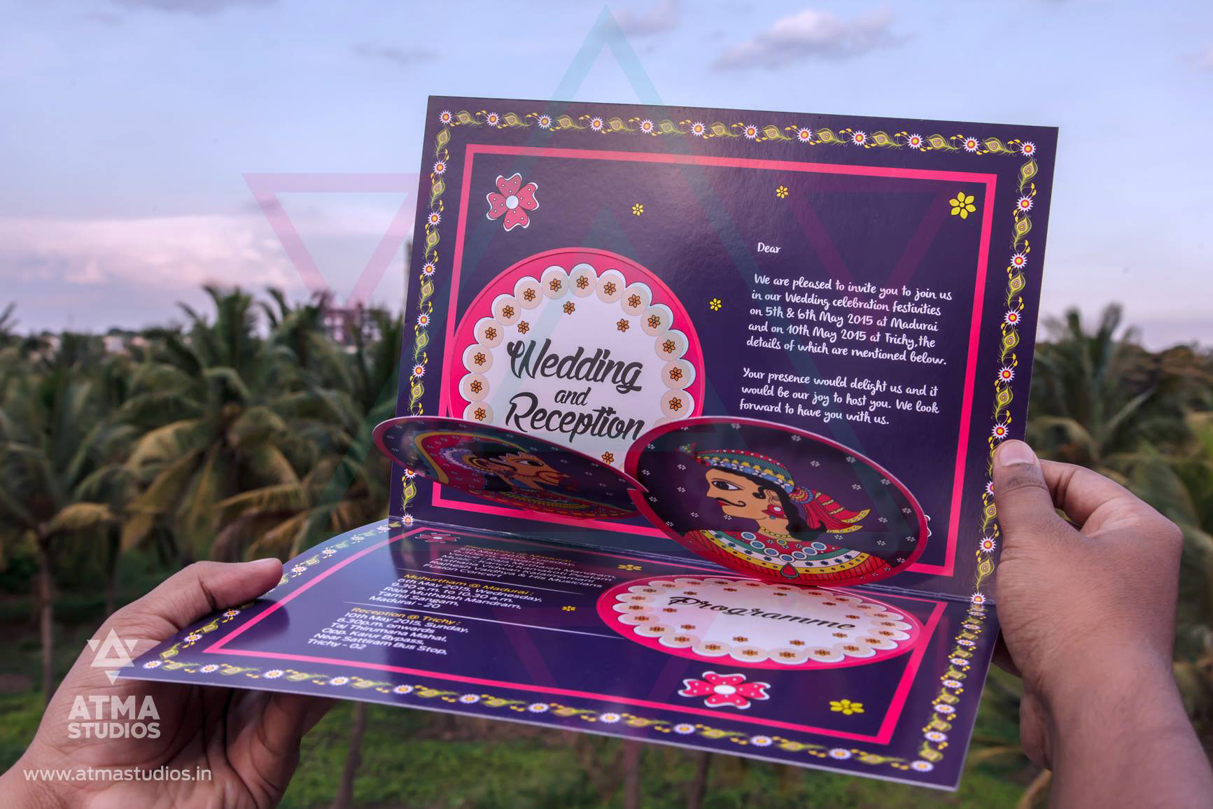 " 16 Blessings is all you need for a complete life “ This classic card’s design is inspired from contemporary Indian folk art illustration style found in Madhubani and Pattachitra art forms which are many centuries old. This invite depicts the 16 wealths that will be bestowed on the couple by the elders during the wedding time. This is as per our Tamil cultural blessing that says “Pathinaarum Peru Vazhvu Vaazhga “ The 16 wealths are individually illustrated and they are Fame, Knowledge, Strength, Success, Progeny, Courage, Finance, Abundance of food, Well-being, Enjoyment of Pleasures, Wisdom, Beauty, Unending Honours, Philanthropy, Birth (Lineage) and Healthy long life. Inviting your guests with this culturally rich card is a great sign in itself. The invite opens to a beautiful illustration of a bride and the groom on the inside. This is a classic wedding invite for your traditional wedding.