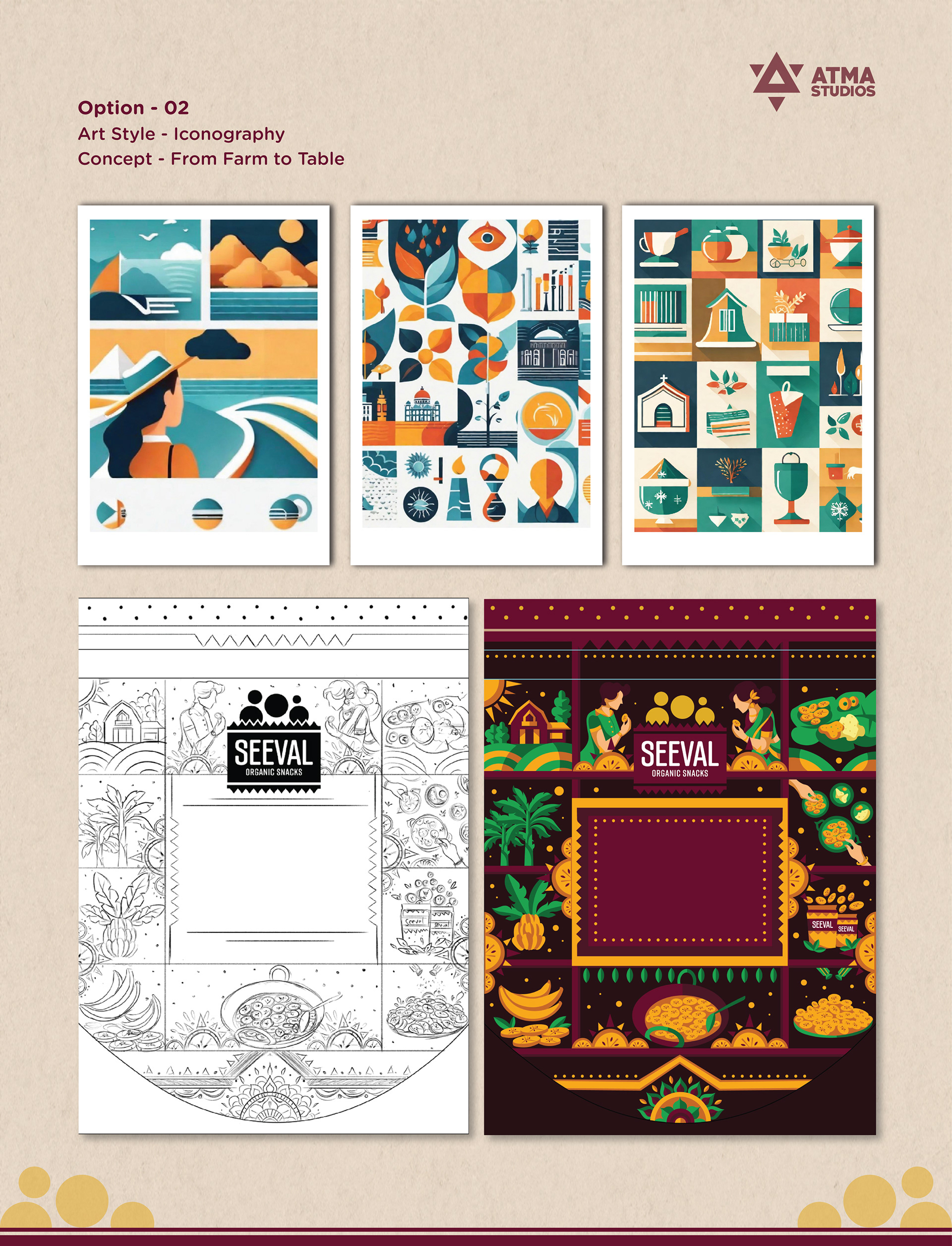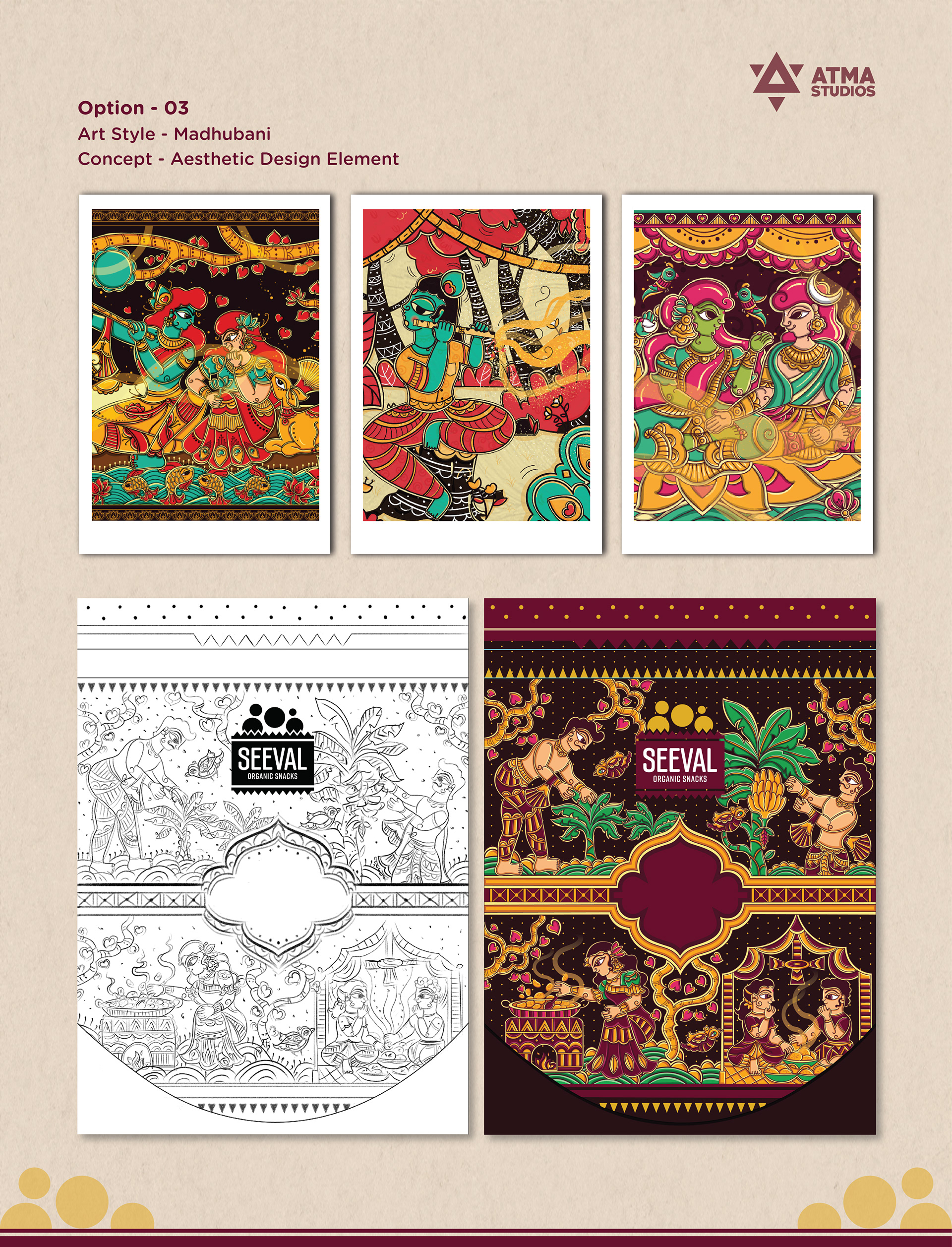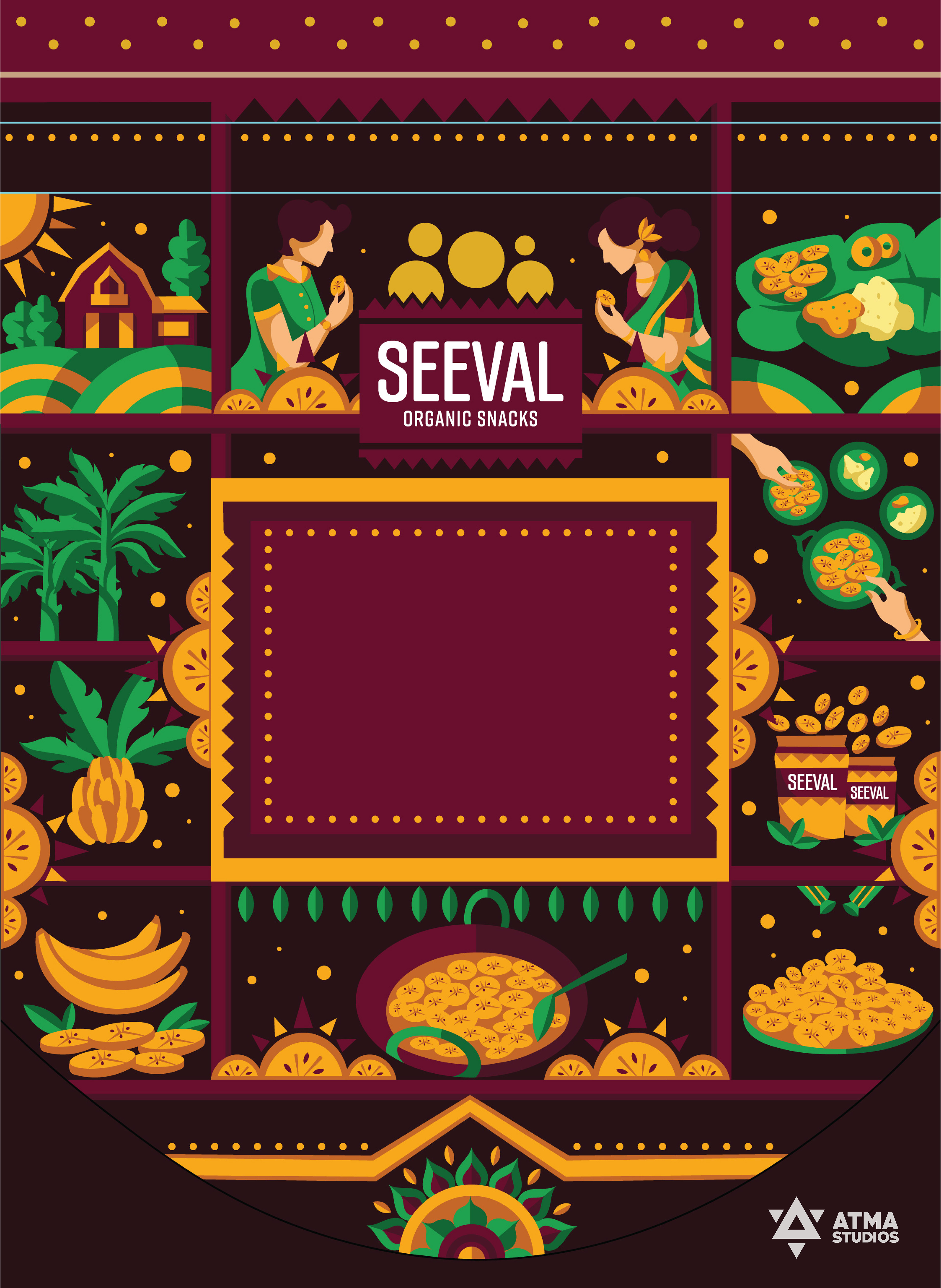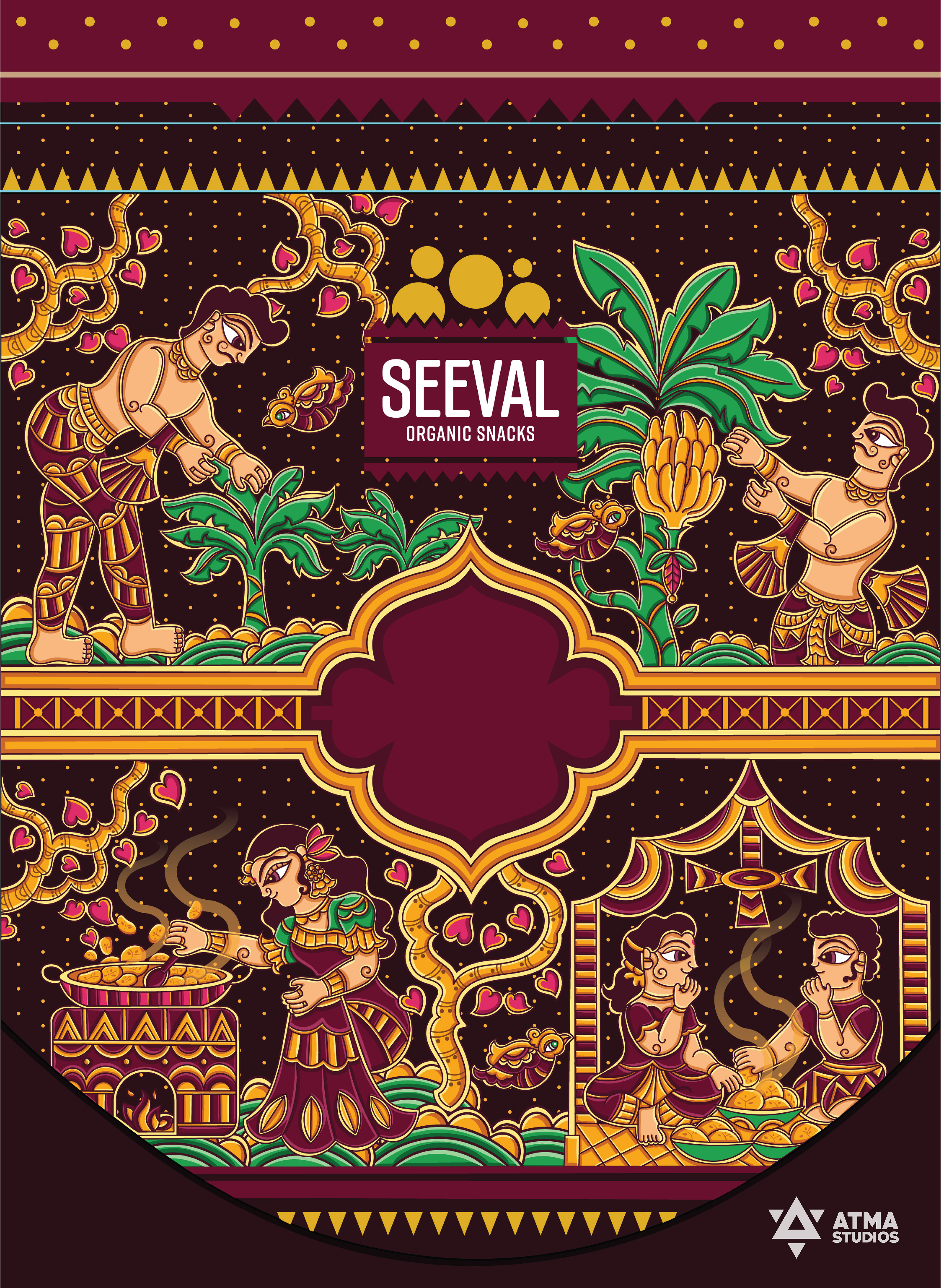 Seeval is a homegrown organic snack brand from Coimbatore, rooted in India’s rich agricultural heritage and culinary traditions. The brand embodies the perfect blend of luxury, authenticity, and taste, celebrating the art of snacking in a wholesome, modern way. At Atma Studios, the visual identity was designed to reflect this essence — combining earthy organic roots with vibrant cultural storytelling. Each design direction reimagines Indian folk and traditional art forms like Chitrasutra, Madhubani, and Iconography, blending them with contemporary aesthetics to create a unique fusion of heritage and modern appeal. From farm to table, Seeval’s brand language narrates the journey of purity, craft, and culture — where every detail, from color palette to typography, celebrates India’s timeless connection to food and nature.