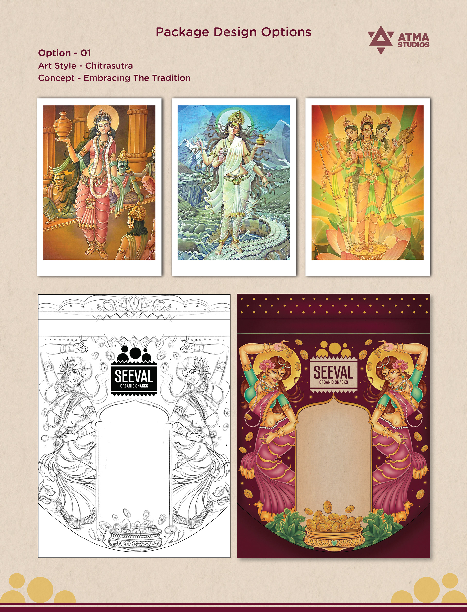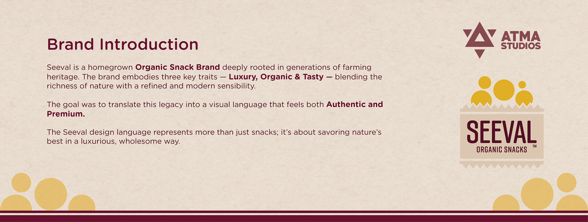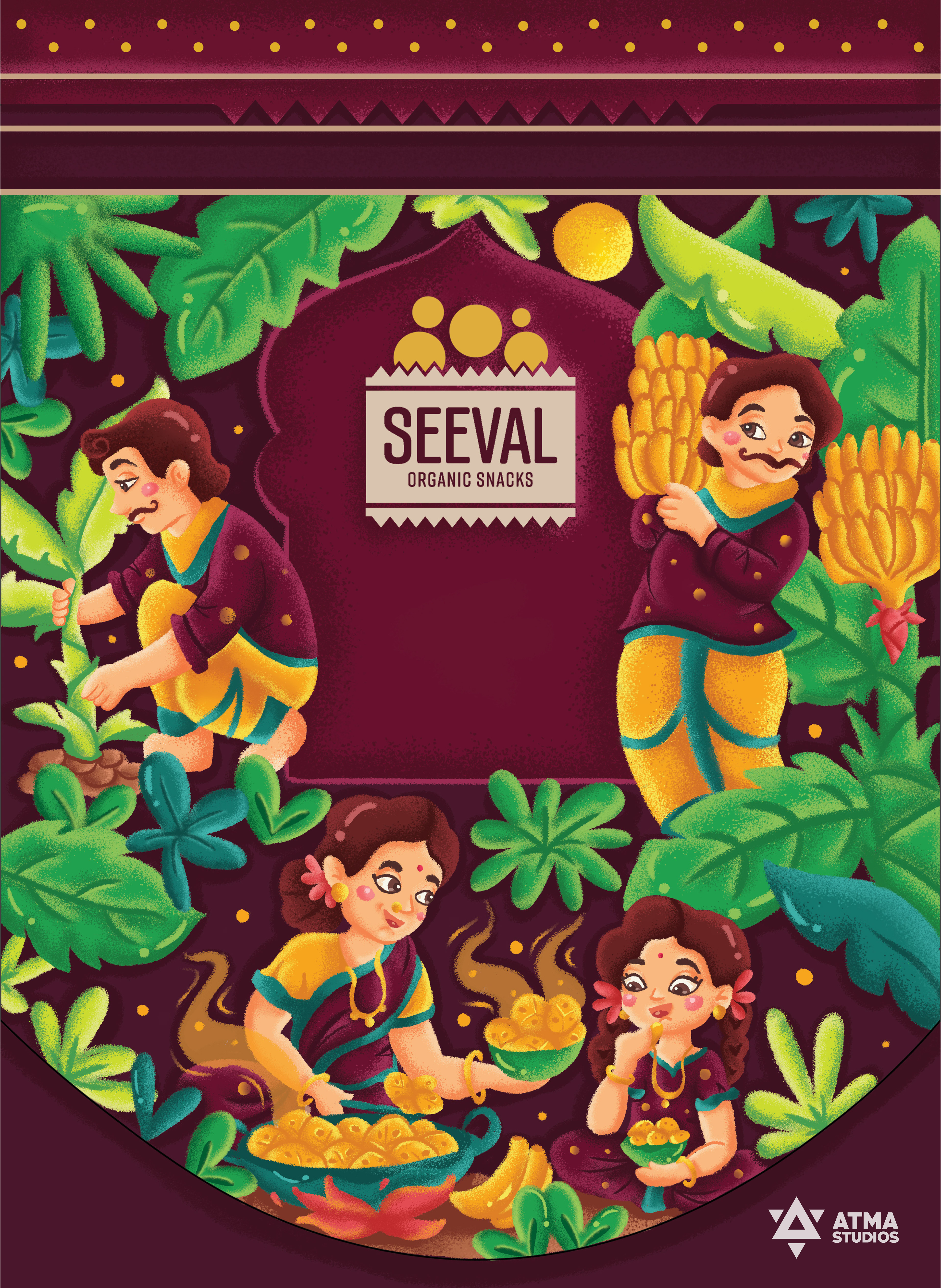 Seeval is a homegrown organic snack brand from Coimbatore, rooted in India’s rich agricultural heritage and culinary traditions. The brand embodies the perfect blend of luxury, authenticity, and taste, celebrating the art of snacking in a wholesome, modern way. At Atma Studios, the visual identity was designed to reflect this essence — combining earthy organic roots with vibrant cultural storytelling. Each design direction reimagines Indian folk and traditional art forms like Chitrasutra, Madhubani, and Iconography, blending them with contemporary aesthetics to create a unique fusion of heritage and modern appeal. From farm to table, Seeval’s brand language narrates the journey of purity, craft, and culture — where every detail, from color palette to typography, celebrates India’s timeless connection to food and nature.