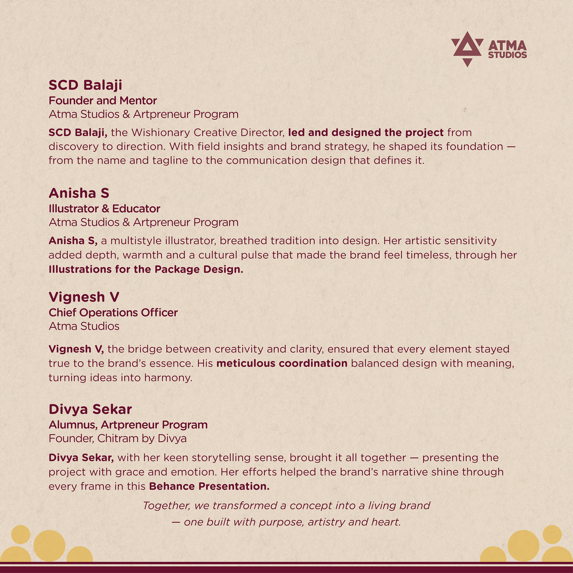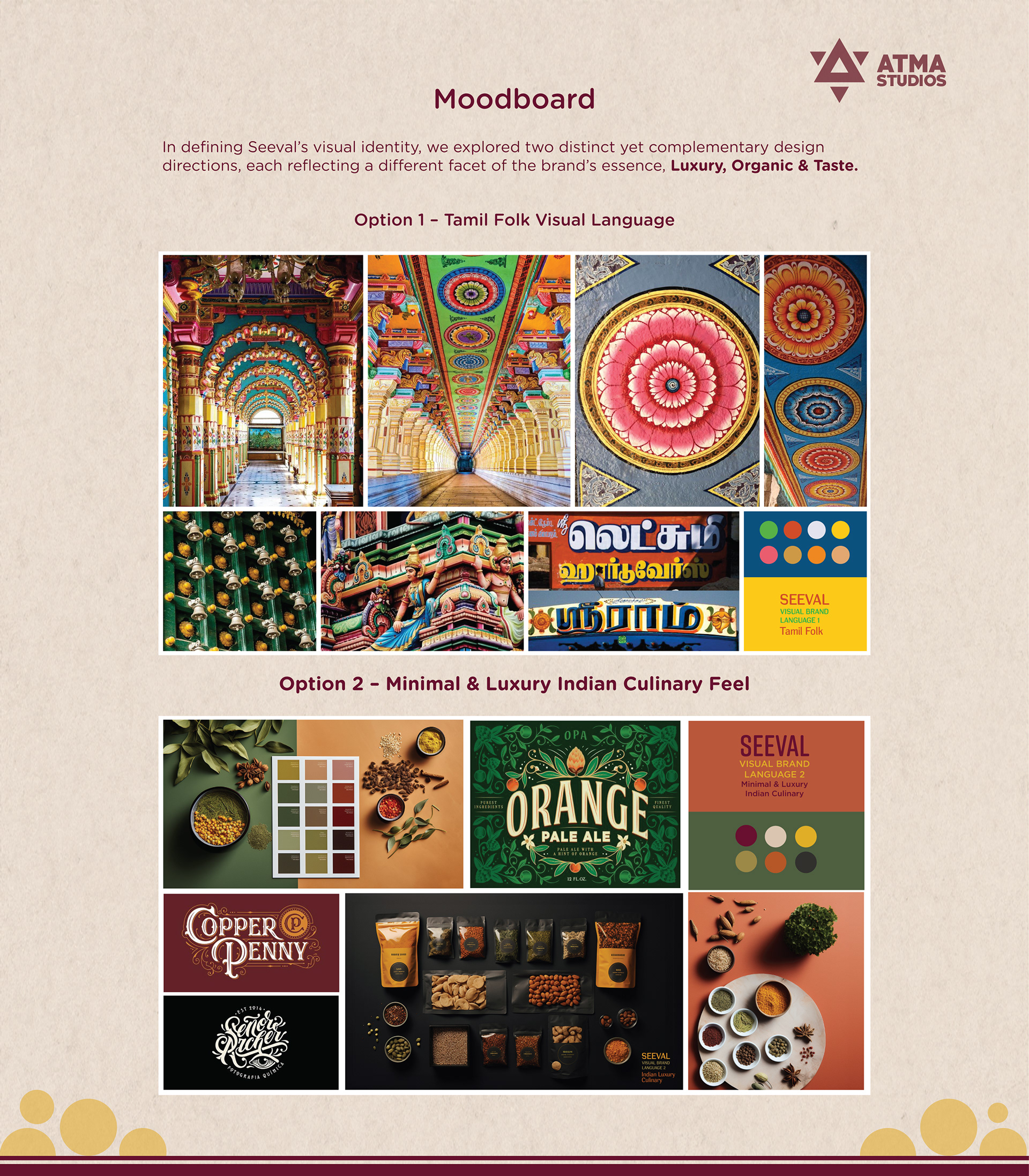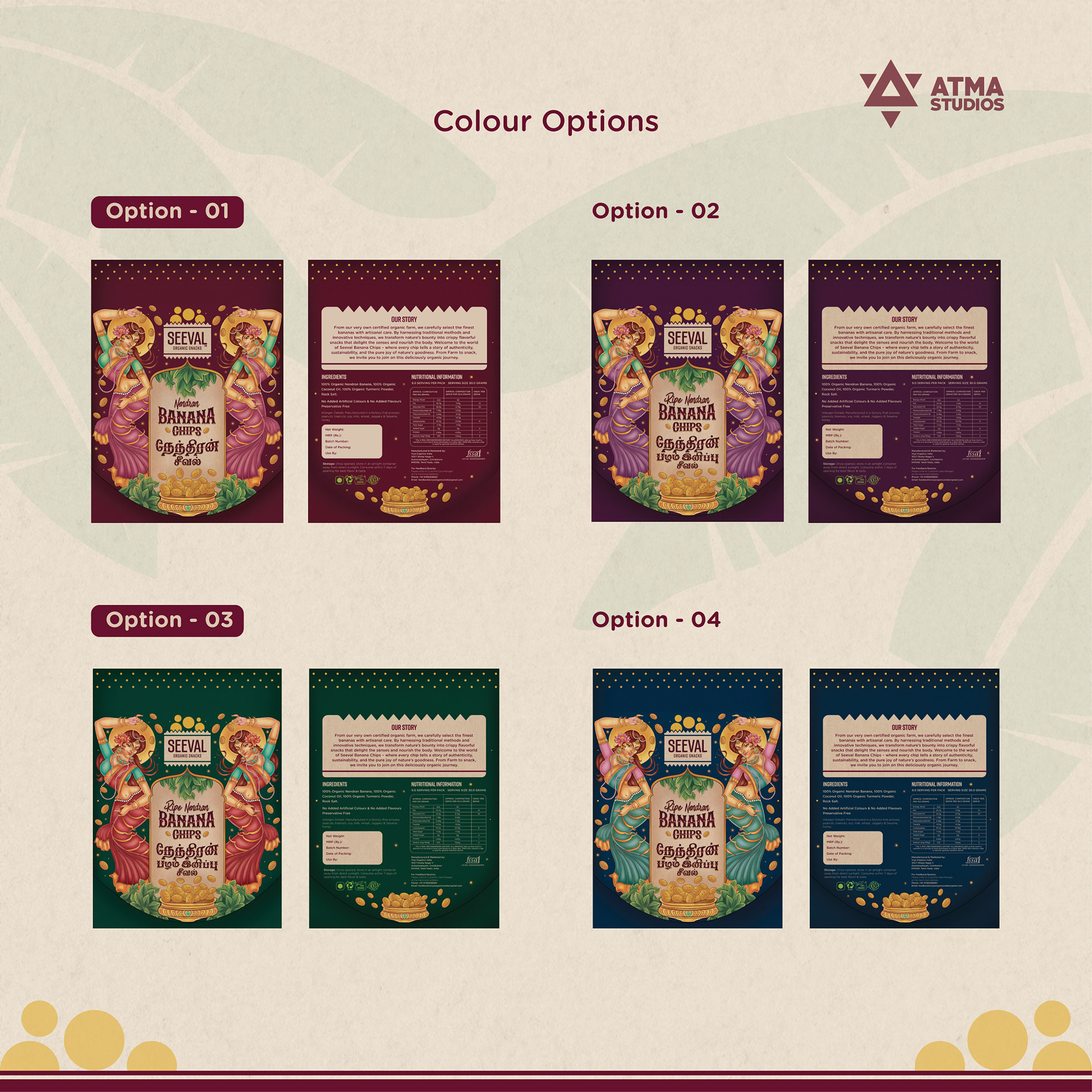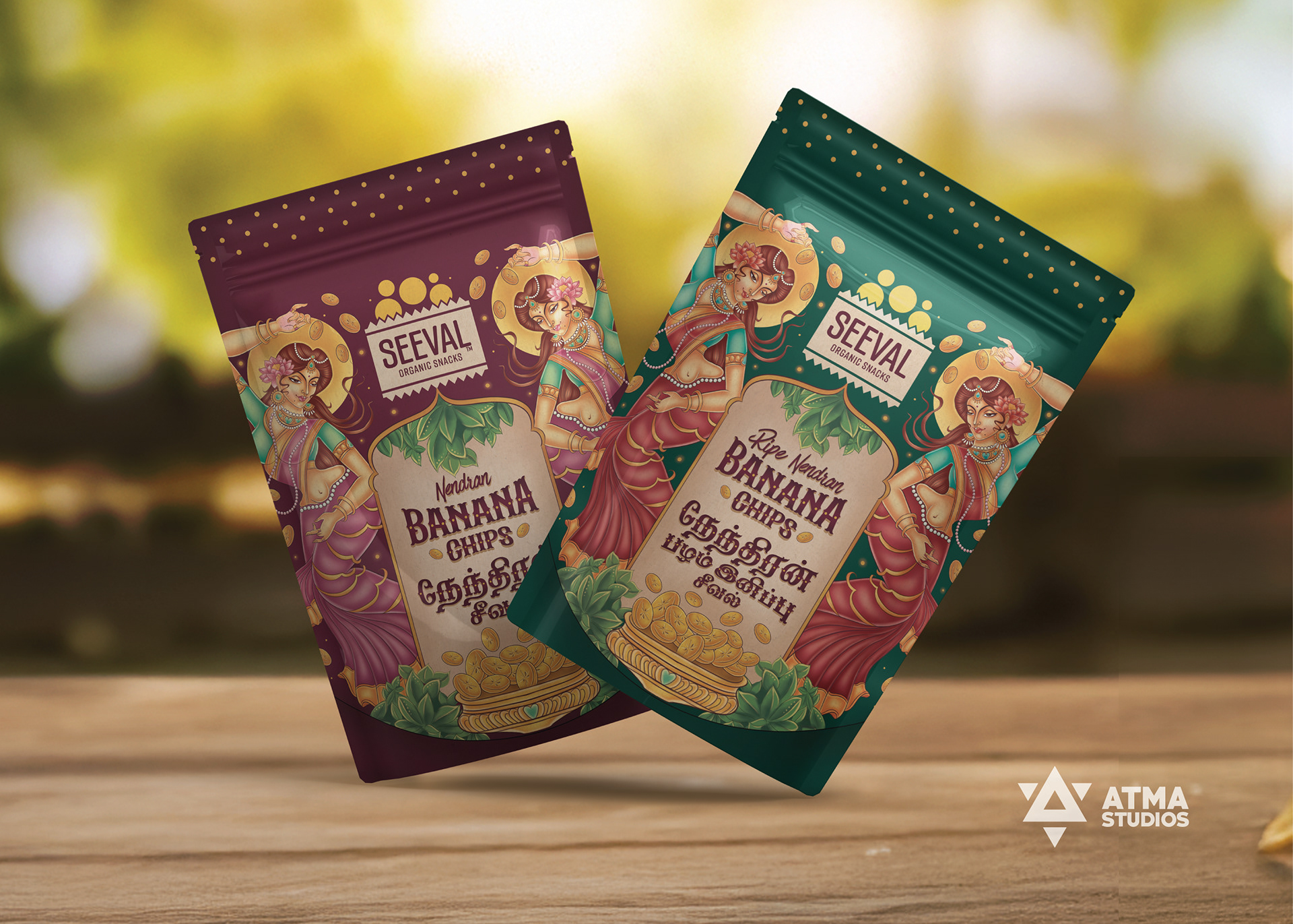 Seeval is a homegrown organic snack brand from Coimbatore, rooted in India’s rich agricultural heritage and culinary traditions. The brand embodies the perfect blend of luxury, authenticity, and taste, celebrating the art of snacking in a wholesome, modern way. At Atma Studios, the visual identity was designed to reflect this essence — combining earthy organic roots with vibrant cultural storytelling. Each design direction reimagines Indian folk and traditional art forms like Chitrasutra, Madhubani, and Iconography, blending them with contemporary aesthetics to create a unique fusion of heritage and modern appeal. From farm to table, Seeval’s brand language narrates the journey of purity, craft, and culture — where every detail, from color palette to typography, celebrates India’s timeless connection to food and nature.