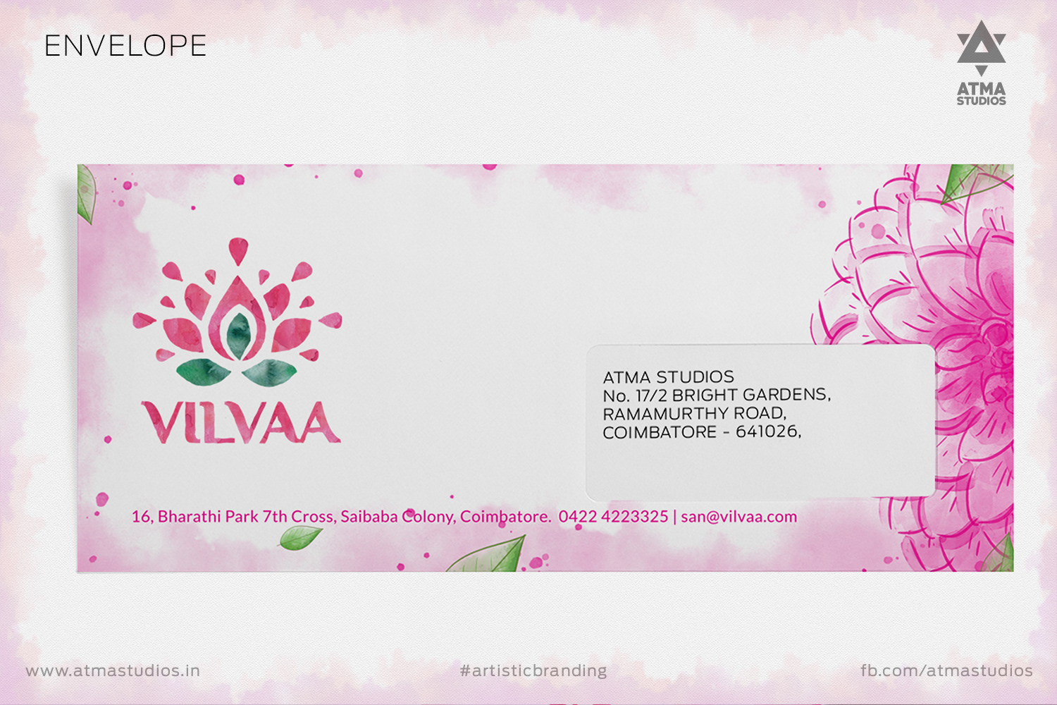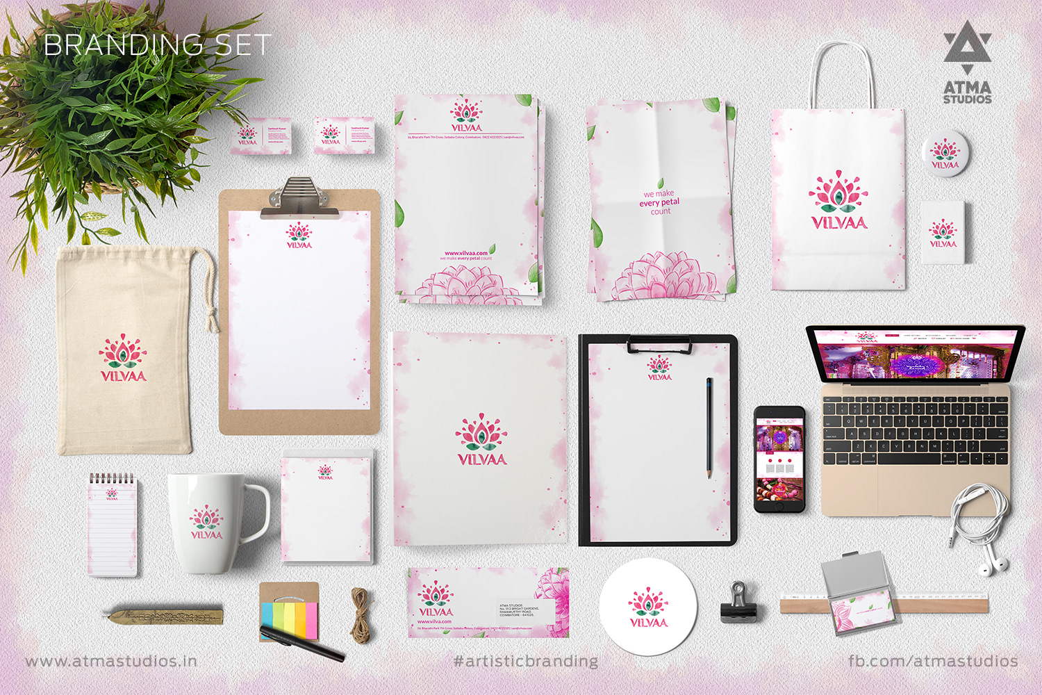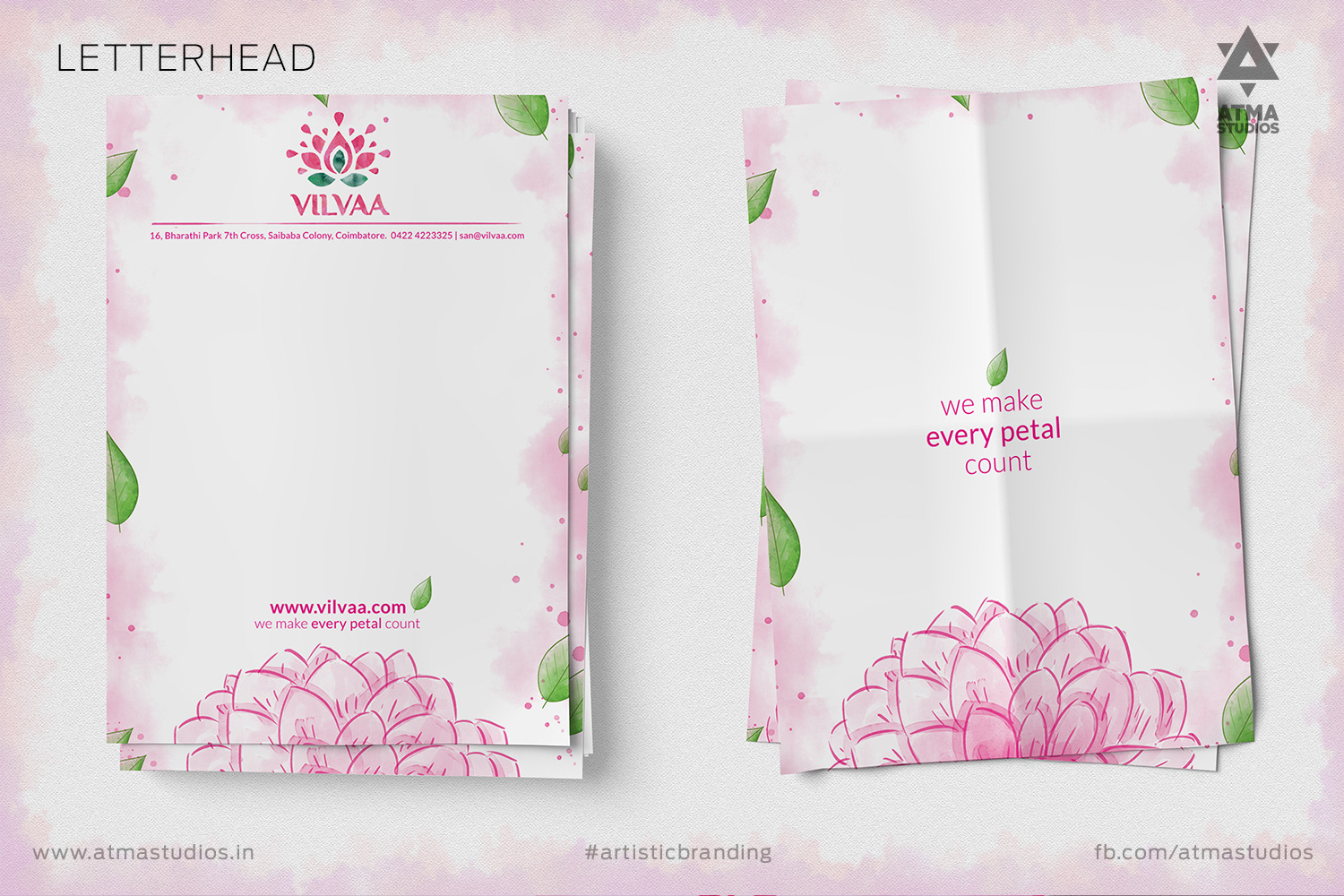 Expectations of the logo The logo was expected to represent flowers at one glance and the brand name to of course relate to floral. Such a kind of logo should disclose that the business is something related to flowers and is nothing but the online garland store. Solution Nothing except for the flowers and leaves could make a better representation of the logo was the first key to solution. Thus working on the same, flower petals and leaves were used in the logo to identify the business to an online garland store. Brand Identity Vilvaa – Vilvaa is an auspicious leaf often represented to divinity. The purpose being the brand name “Vilvaa” used is to represent the more special occurrence that we make on any auspicious events like wedding, home functions and more. Flowers – Whenever we tend to think of a flower, it more often appears to be in pink at first rather than any other color. And thus the color pink is used for the petals. It is a normal phenomenon of illustrating the flowers in watercolor, to make a lively appearance. And thus the logo being illustrated in water color. As known that the leaves are the food factory of the plant, it is more essential that the leaves play an important role for the flowers to blossom. Also said that the garlands look more elegant with both the flowers and leaves being the attractive combination of colors. And so is the leaves in the middle of the logo.