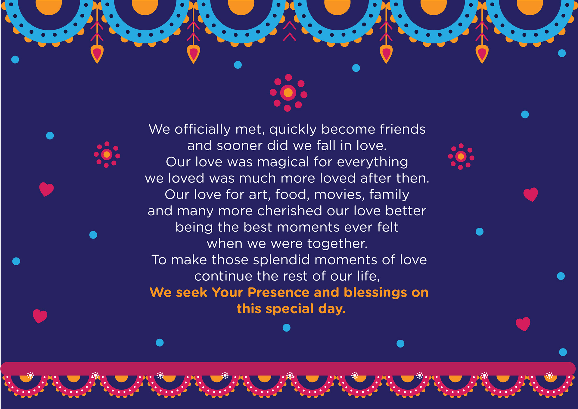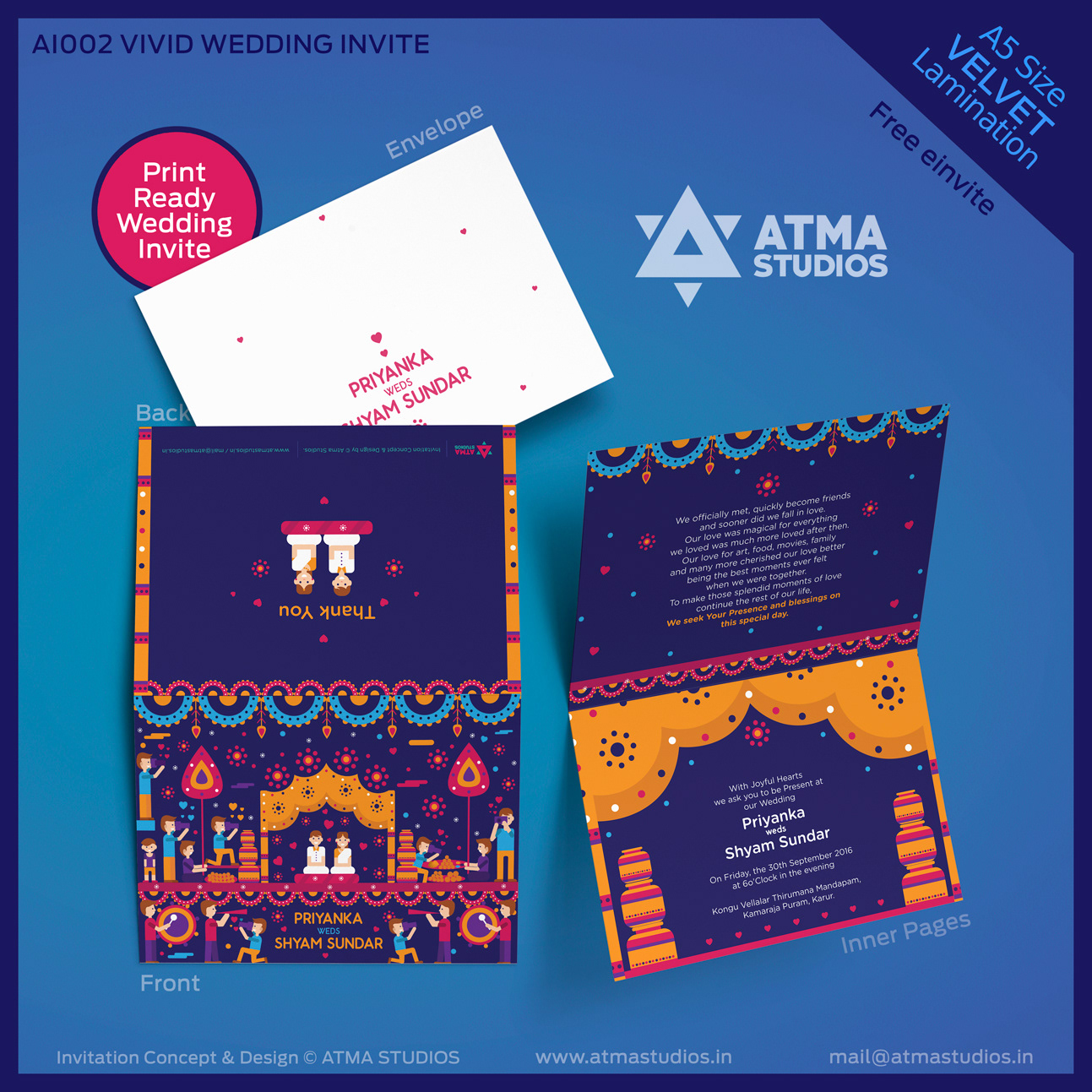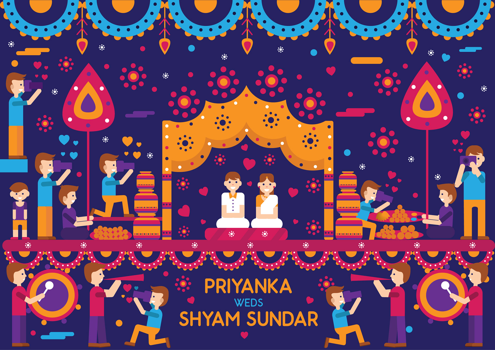 “ Magical weddings need magical invites “ The Wedding day is always about the bride and the groom. But there are hundreds of people who work in tandem to give the guests, an experience of a lifetime. Indian Weddings are known for colors, grandeur, flowers, sweets, dance, food, rituals, sangeet, mehendi and this invite card depicts it all beautifully in simple and lively illustrations. One look at the invite and everyone will be reminded of vividness of every Indian Wedding. It is a celebration of two souls coming together as one amidst hundreds of souls who wish only the best for them. This print ready invite comes as a four page card and a customized envelope and your guests are sure to admire this beauty.