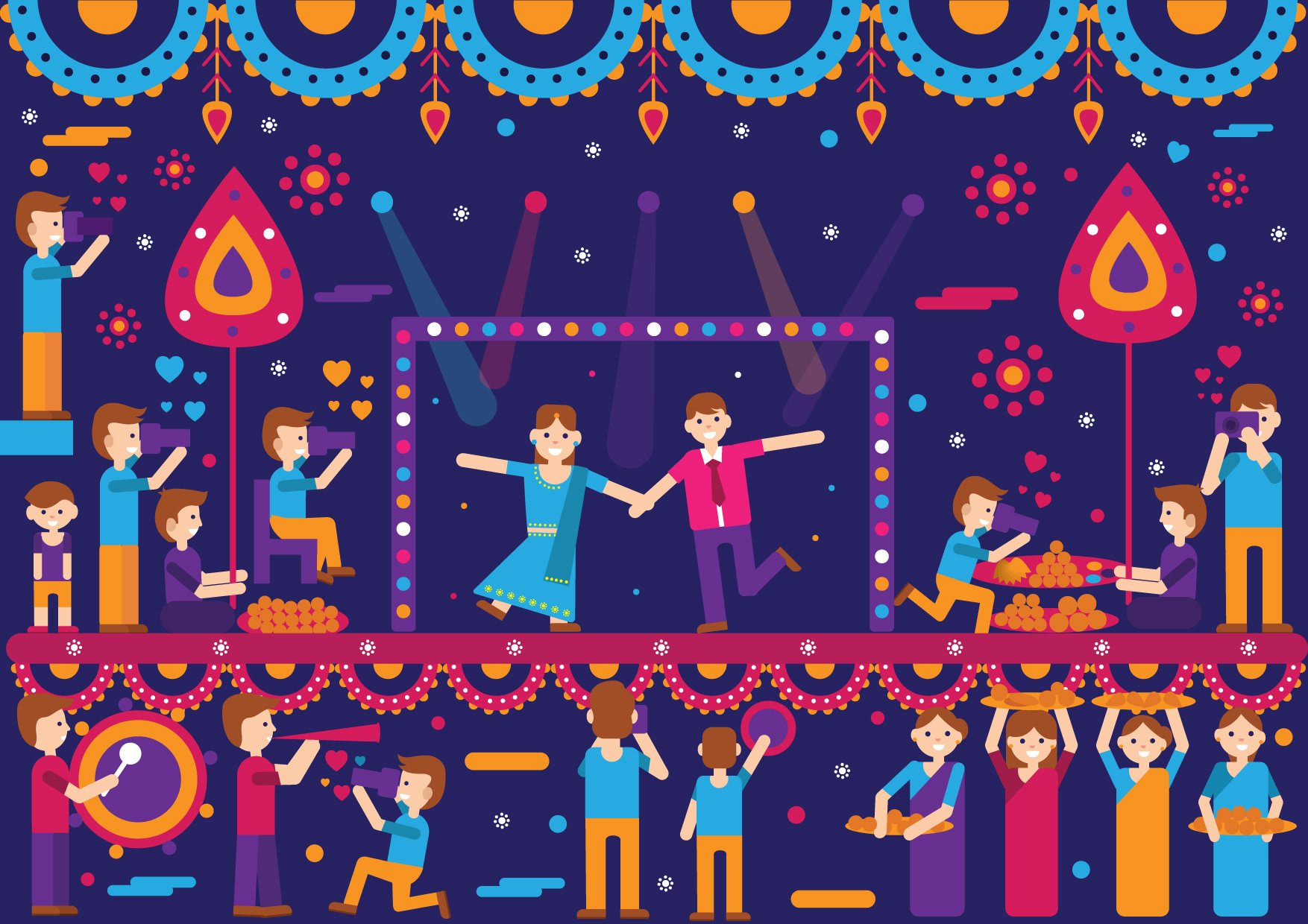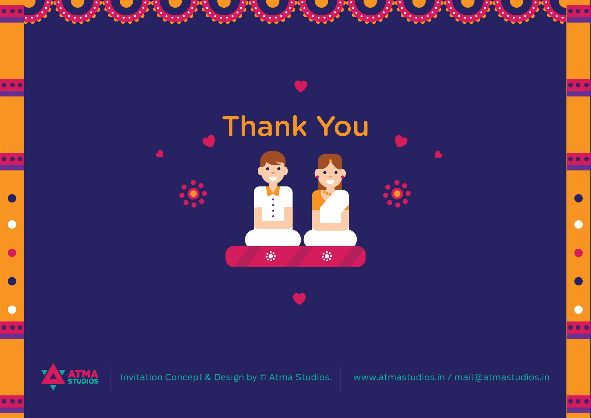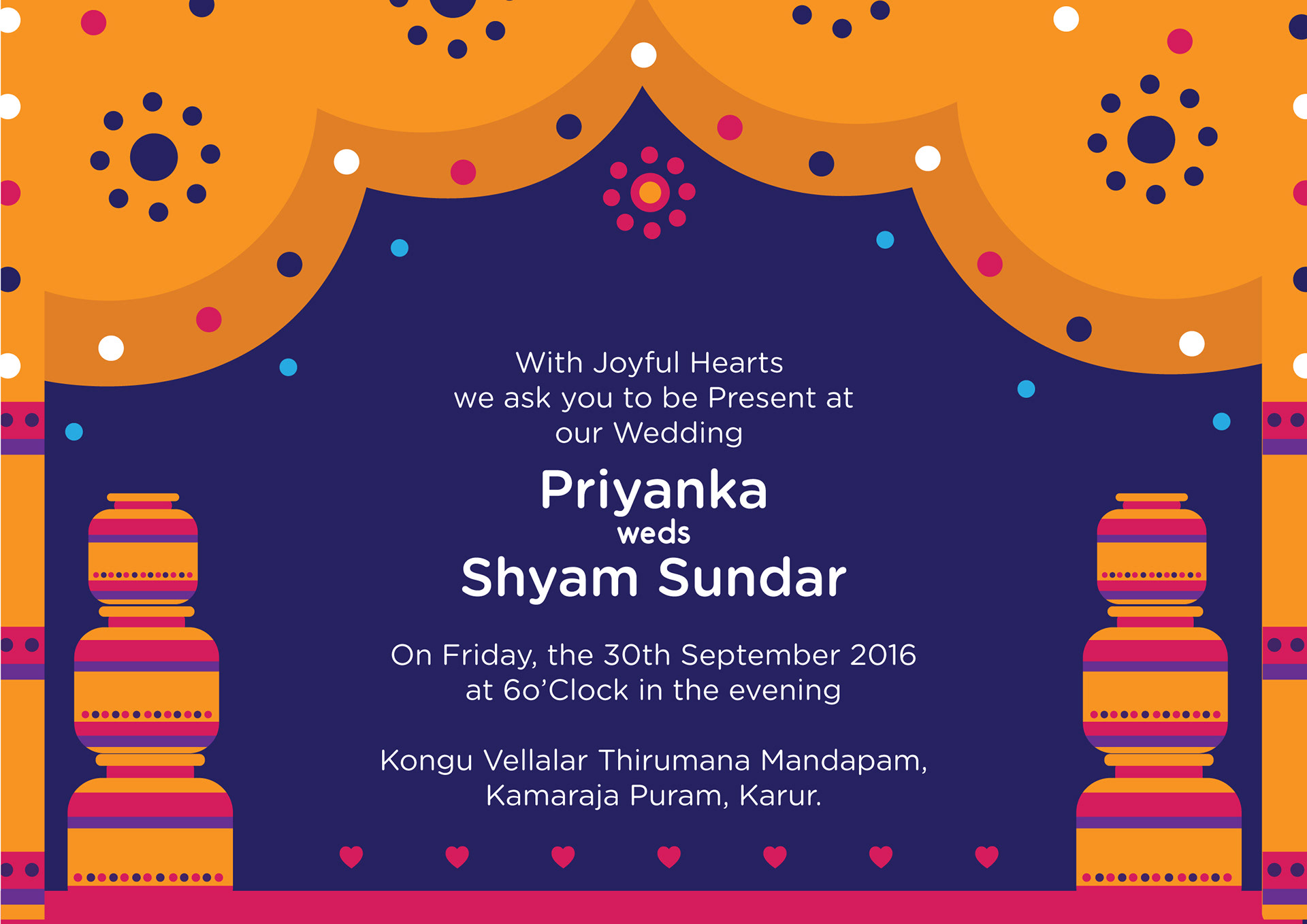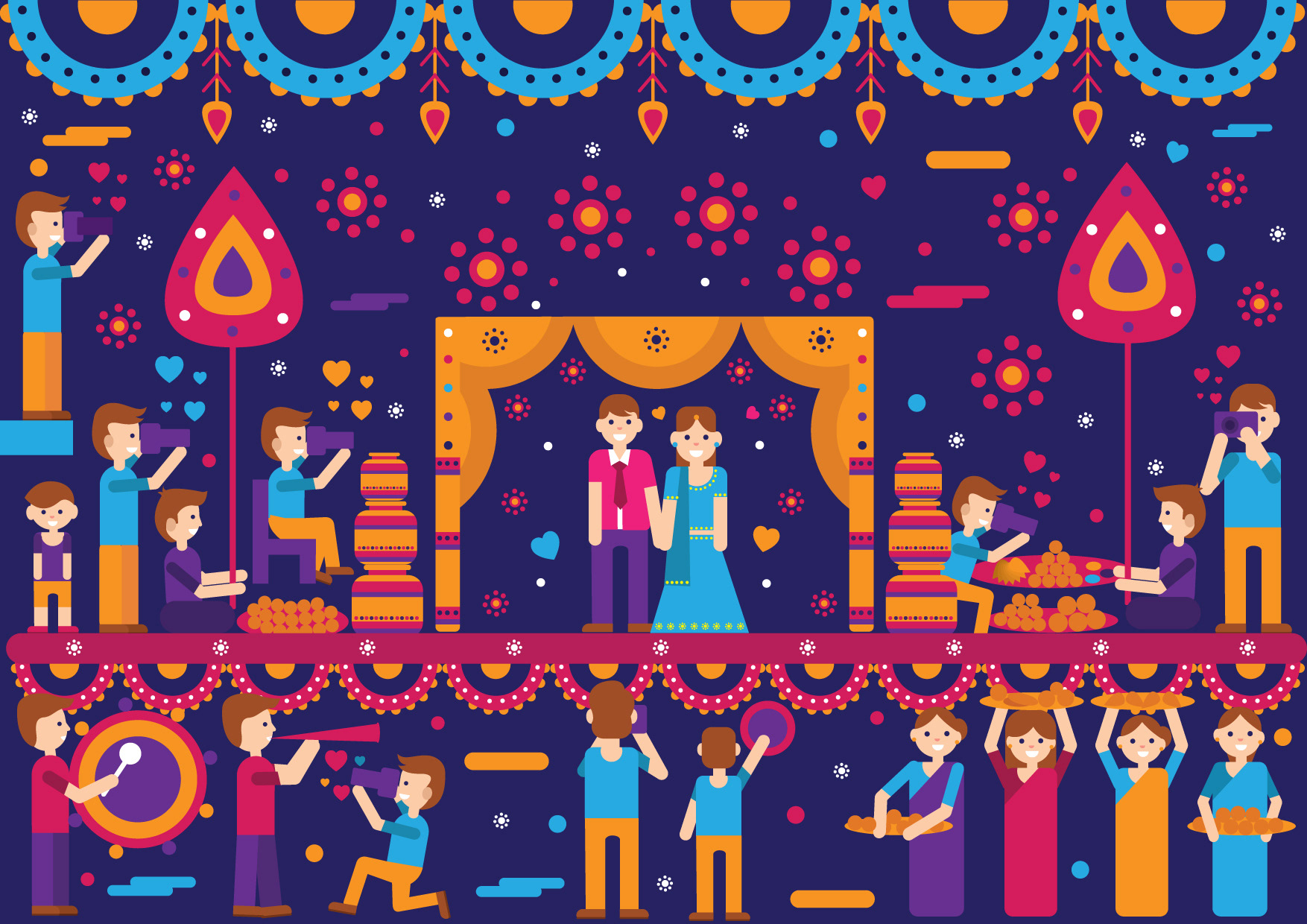 “ Magical weddings need magical invites “ The Wedding day is always about the bride and the groom. But there are hundreds of people who work in tandem to give the guests, an experience of a lifetime. Indian Weddings are known for colors, grandeur, flowers, sweets, dance, food, rituals, sangeet, mehendi and this invite card depicts it all beautifully in simple and lively illustrations. One look at the invite and everyone will be reminded of vividness of every Indian Wedding. It is a celebration of two souls coming together as one amidst hundreds of souls who wish only the best for them. This print ready invite comes as a four page card and a customized envelope and your guests are sure to admire this beauty.